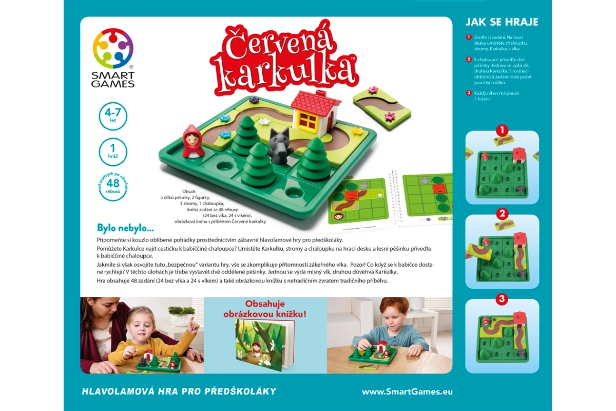 Mīklu spēle Sarkangalvīte sniedz izklaidi un mācīšanos pašiem mazākajiem. Novietojiet figūriņas un meža elementus uz laukuma un izveidojiet ceļu līdz vecmāmiņai. Tā ir ideāla stratēģiskās un loģiskās domāšanas attīstīšanai bērniem: