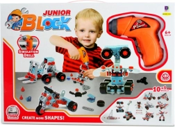 Attīstiet radošumu un sīko motoriku ar universālo Junior Block konstruktoru. Komplektā ir 286 detaļas, tostarp simulēta akumulatora skrūvmašīna, un tas ļauj bērniem no 6 gadu vecuma būvēt līdz pat 10 dažādiem modeļiem – transportlīdzekļus, robotus un citas konstrukcijas. Praktisks iepakojums (aptuveni 41 × 29 × 6 cm) un viegla skrūvēšana ar plastmasas skrūvēm un uzgriežņiem nodrošinās stundām ilgu izklaidi. Skrūvmašīna darbojas ar 2× AA baterijām (nav iekļautas).