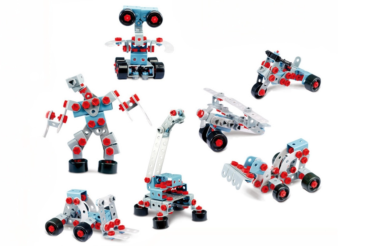 Moduļu sijas, savienotāji, riteņi un skrūves ļauj veikt atkārtotas pārbūves. Ideāli piemērots sīkās motorikas un tehniskās domāšanas attīstīšanai.
