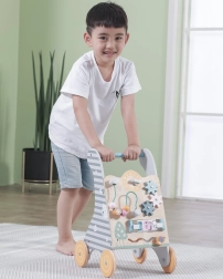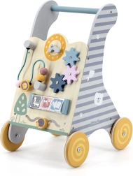 Izglītojošais staigulis bērniem no zīmola Viga Toys, ieteicams no 18 mēnešu vecuma, apvieno kustību un mācību aktivitātes, pateicoties panelim ar formām un krāsām.