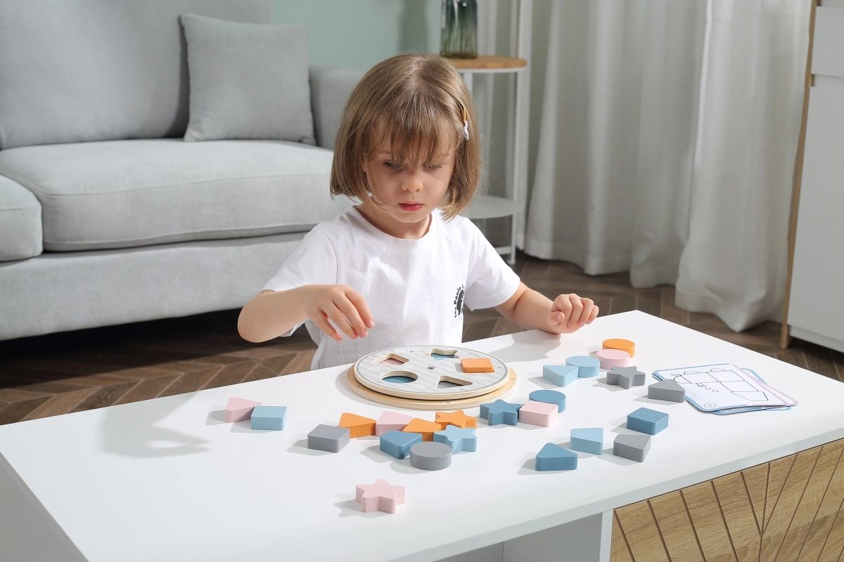 Bērni pielāgo koka detaļas izgriezumiem uz pamatnes un dabiski apgūst krāsas un pamatformas – apli, kvadrātu, trīsstūri un zvaigzni.