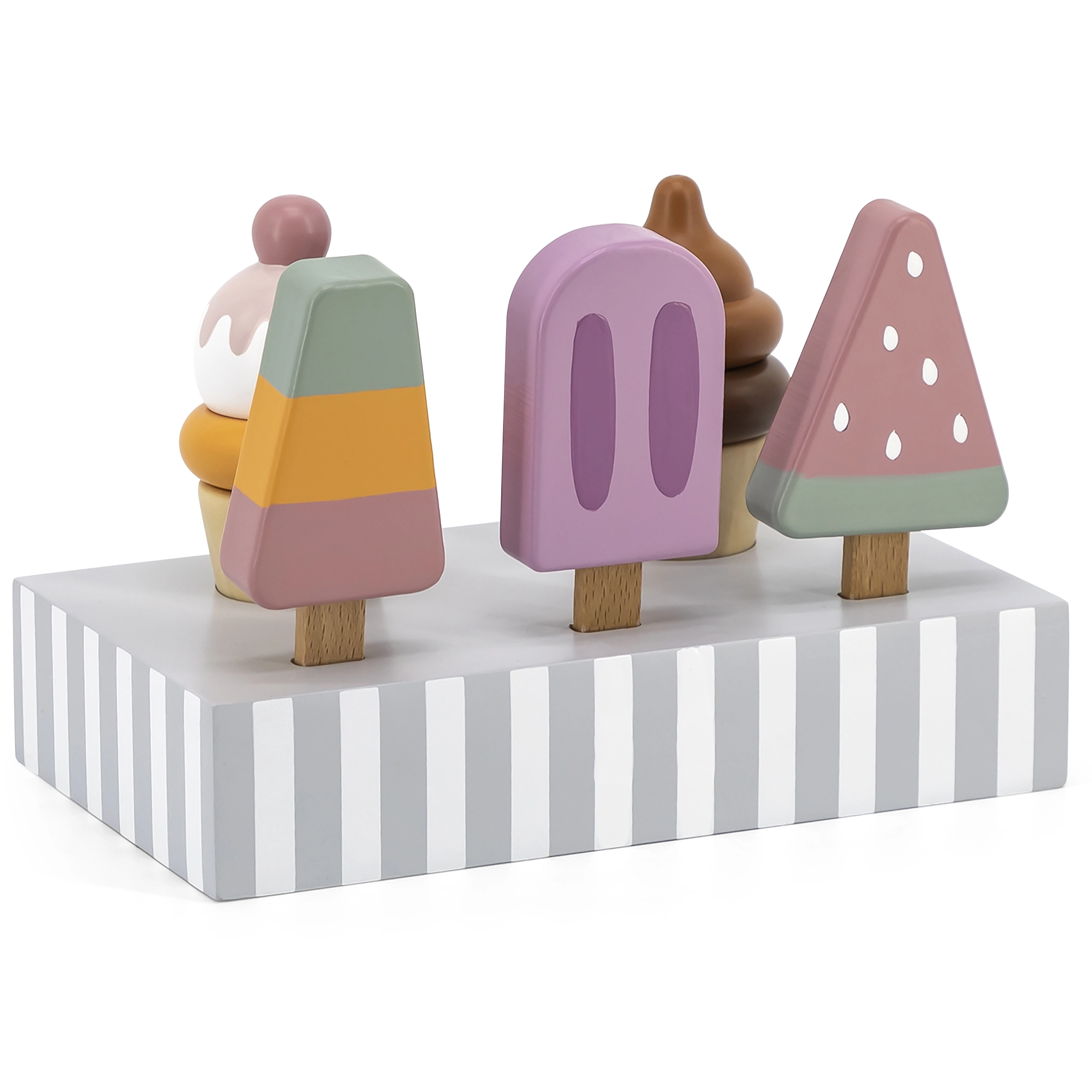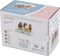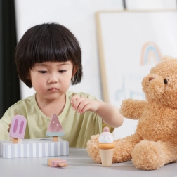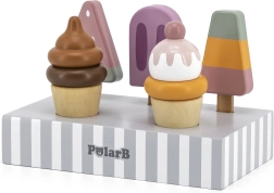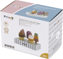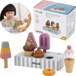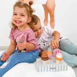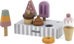 Komplekts ar 5 koka saldējumiem pievilcīgās krāsās sniedz bērniem bezgalīgu izklaidi. Saldējumi ir novietoti uz stabila koka statīva, kas kalpo gan izstādīšanai, gan pārskatāmai glabāšanai. Viss izgatavots no kvalitatīva koka un krāsots ar drošām, netoksiskām krāsām.