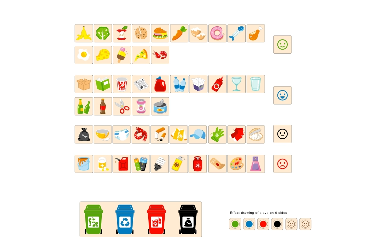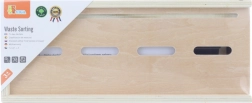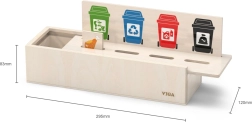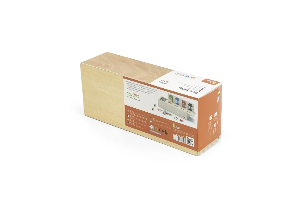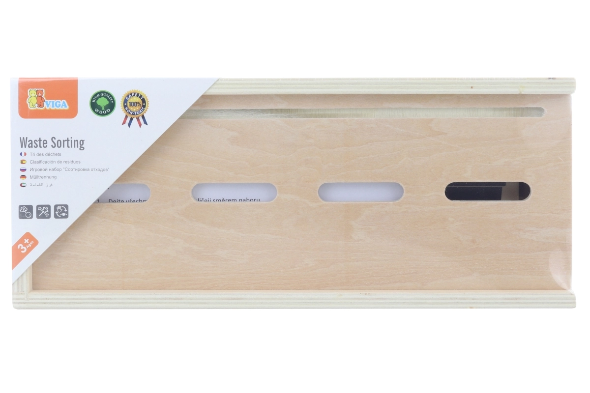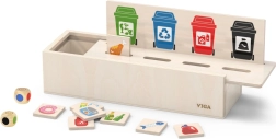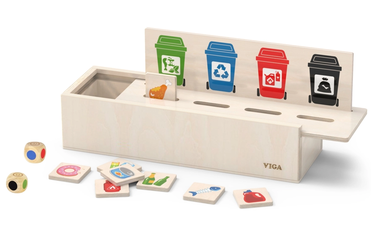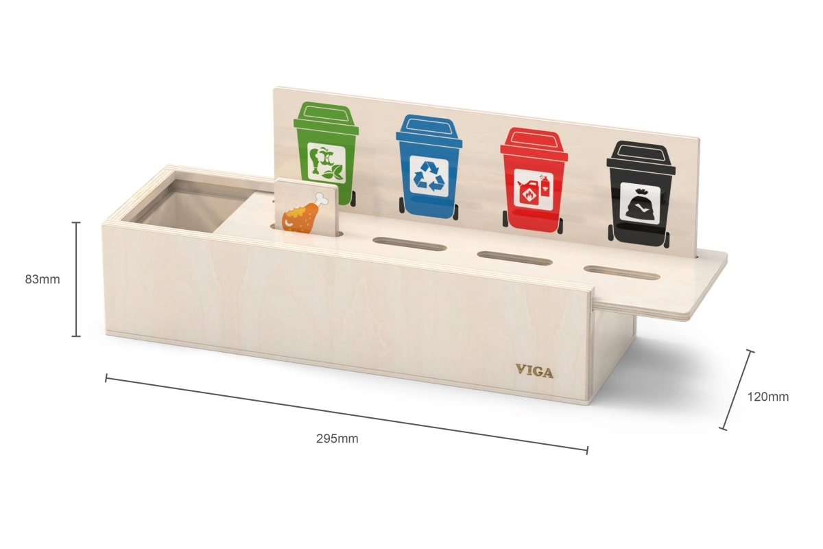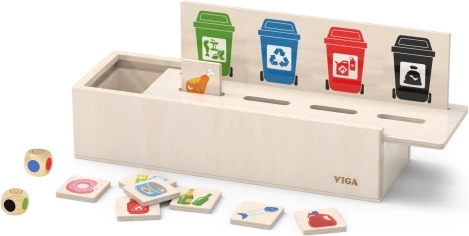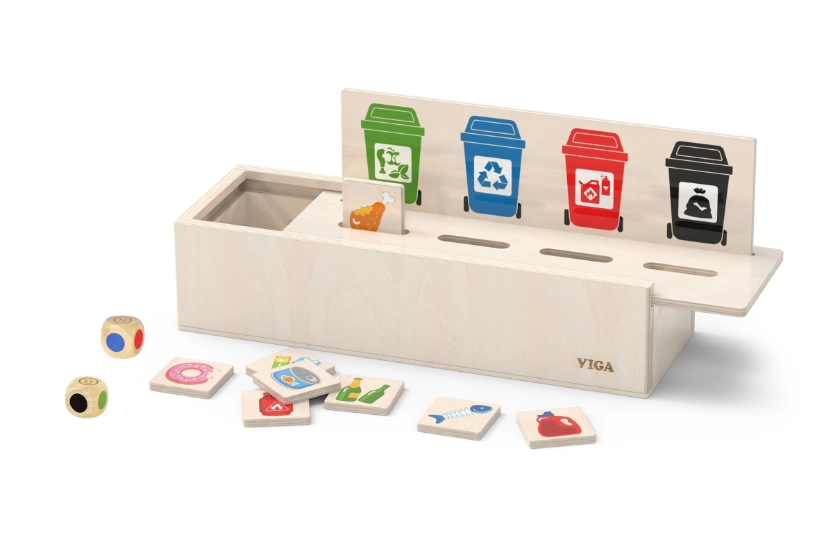 Šī VIGA izglītojošā rotaļlieta ir ideāli piemērota bērniem, kuri apgūst atkritumu šķirošanas pamatus. Komplektā ir koka kaste ar atverēm plāksnīšu iemešanai un plakāts ar dažādiem atkritumu konteineriem. Iekļautas arī 50 koka plāksnītes ar atkritumu attēliem un krāsām, kas atbilst pārstrādes kategorijām.