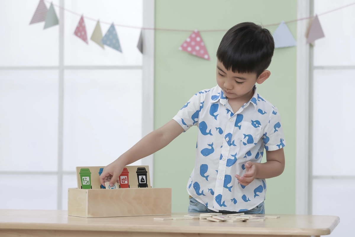 Izglītojiet bērnus jautrā un interaktīvā veidā ar VIGA koka rotaļlietu, kas izstrādāta, lai mācītu atkritumu šķirošanu un veicinātu vides apziņu.