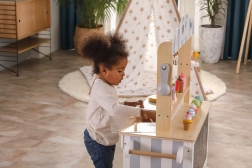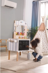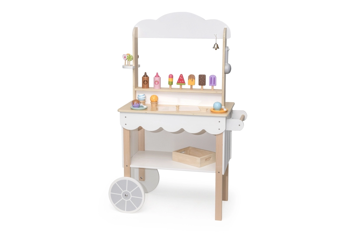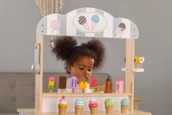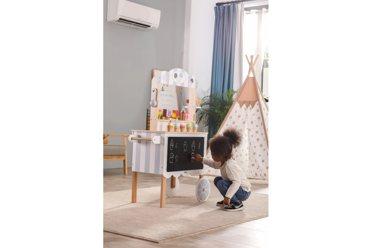 Šis koka stenda komplekts darbojas kā veikals, konditoreja vai saldējuma stends. Bērni var izspēlēt savu iecienītāko scenāriju, izmantojot daudzos piederumus, piemēram, ledenes, saldējumus, vafeļu trauciņus un mērces. Lieliska komplekta daļa ir tāfele, uz kuras rakstīt vai zīmēt šodienas ēdienkarti. Viss komplekts ir krāsots ar netoksiskām krāsām maigos toņos, kas piesaista bērnu uzmanību.