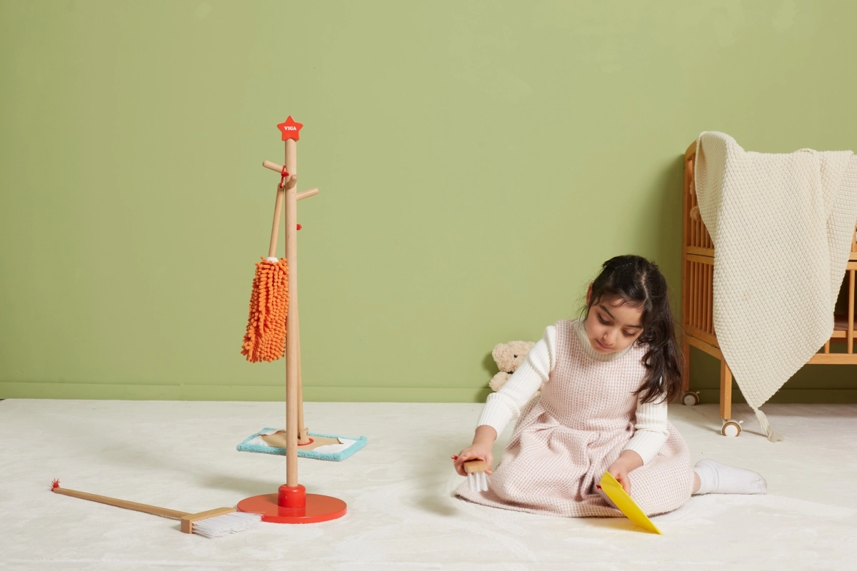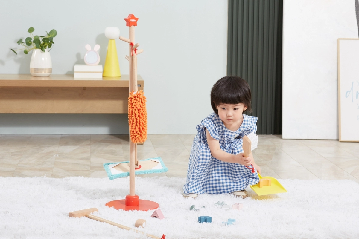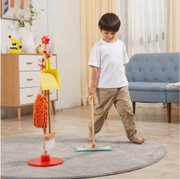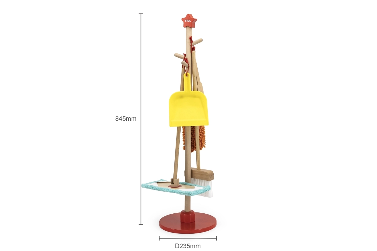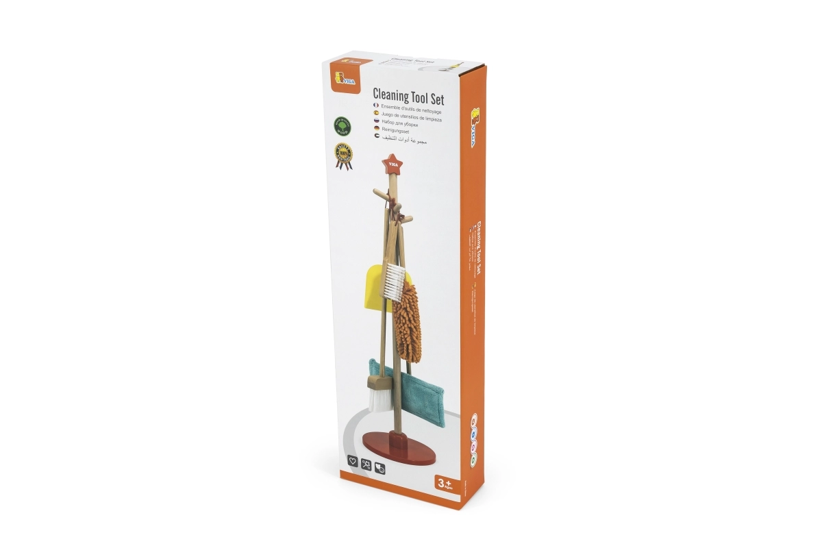 Viga koka uzkopšanas komplekts ir ideāls mazajiem palīgiem, kuri vēlas aktīvi piedalīties kārtības uzturēšanā. Pateicoties šim komplektam, kurā ietilpst slotas, mops, putekļu slota un citi rīki, bērni attīsta savas motoriskās prasmes un rotaļājoties apgūst atbildību.