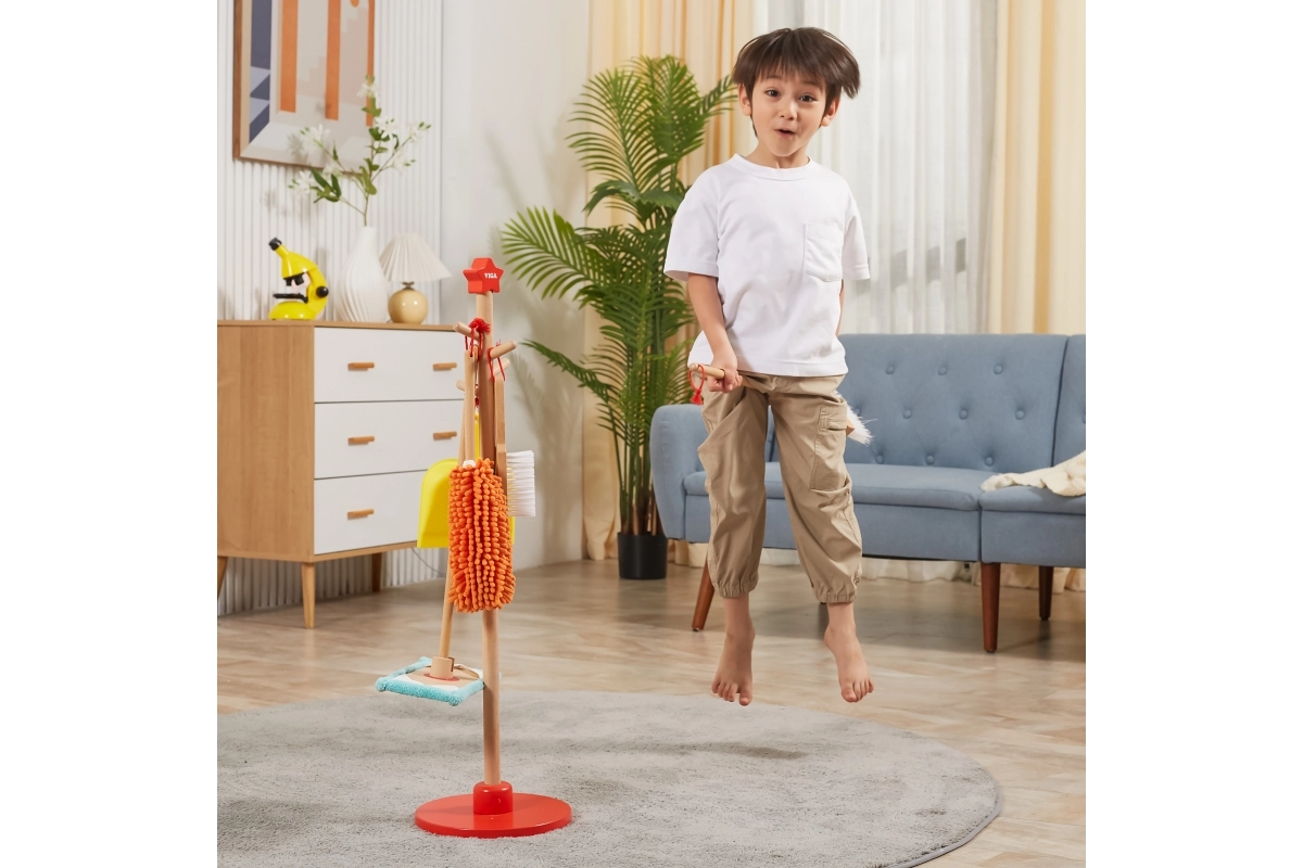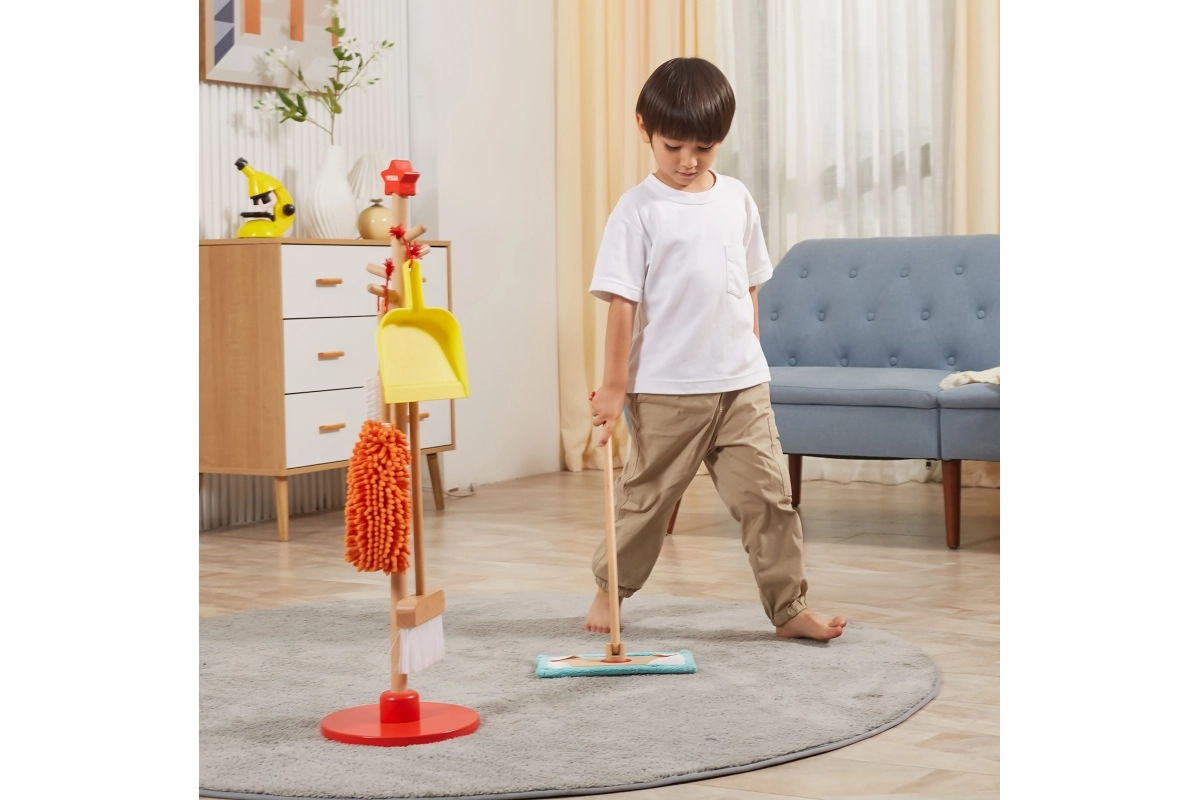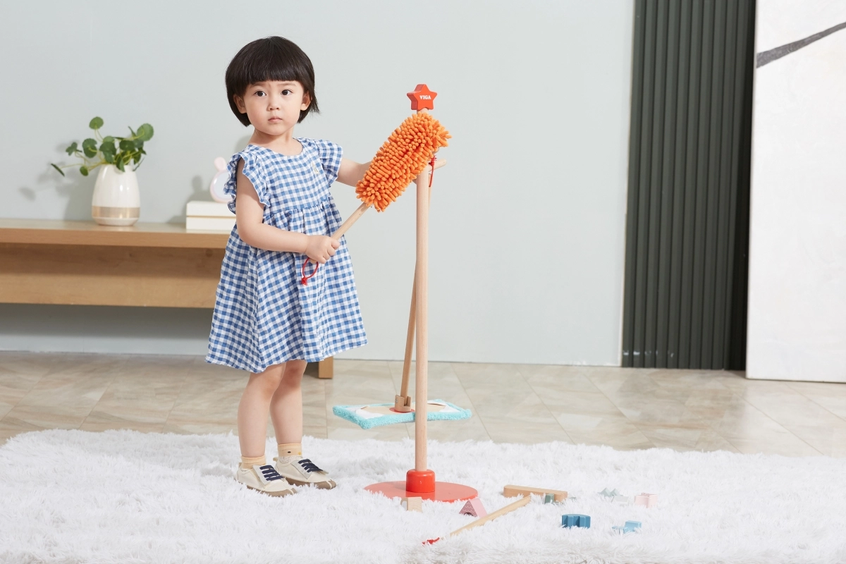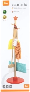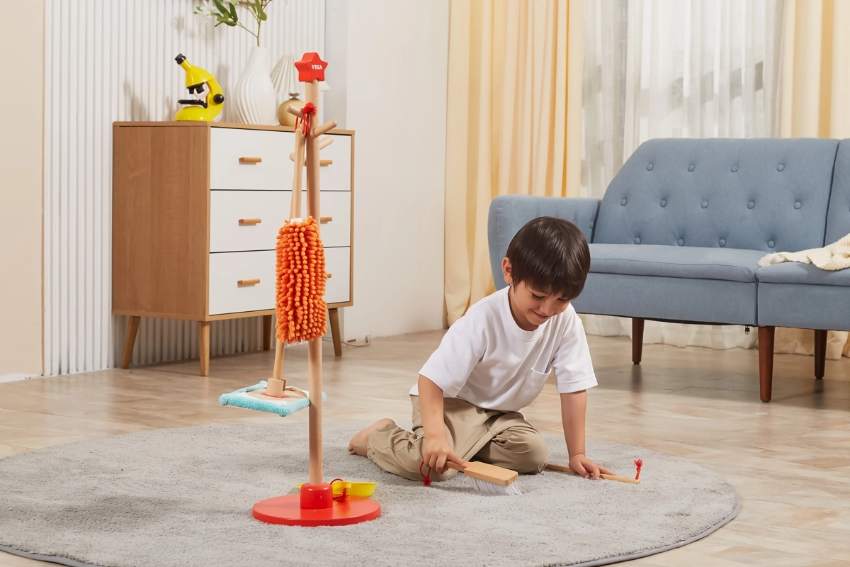 Viga koka uzkopšanas komplekts ir ideāls mazajiem palīgiem, kuri vēlas aktīvi piedalīties kārtības uzturēšanā. Pateicoties šim komplektam, kurā ietilpst slotas, mops, putekļu slota un citi rīki, bērni attīsta savas motoriskās prasmes un rotaļājoties apgūst atbildību.