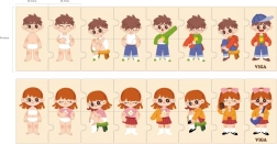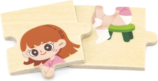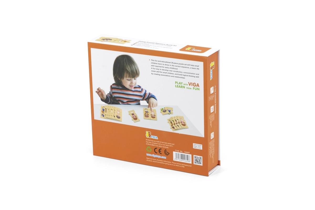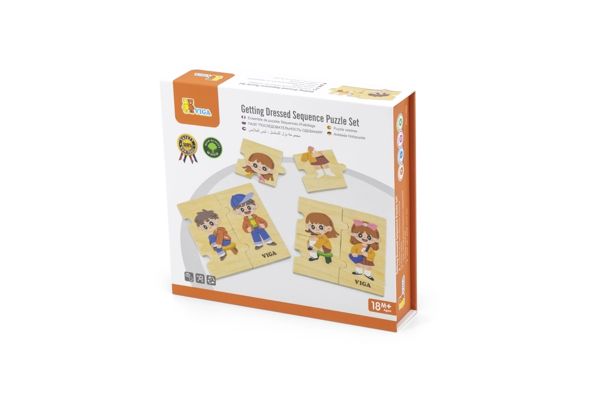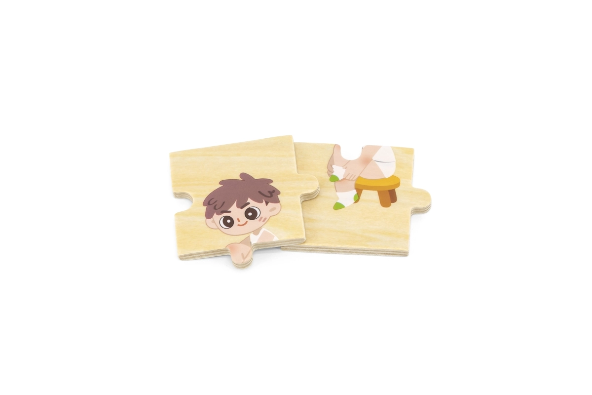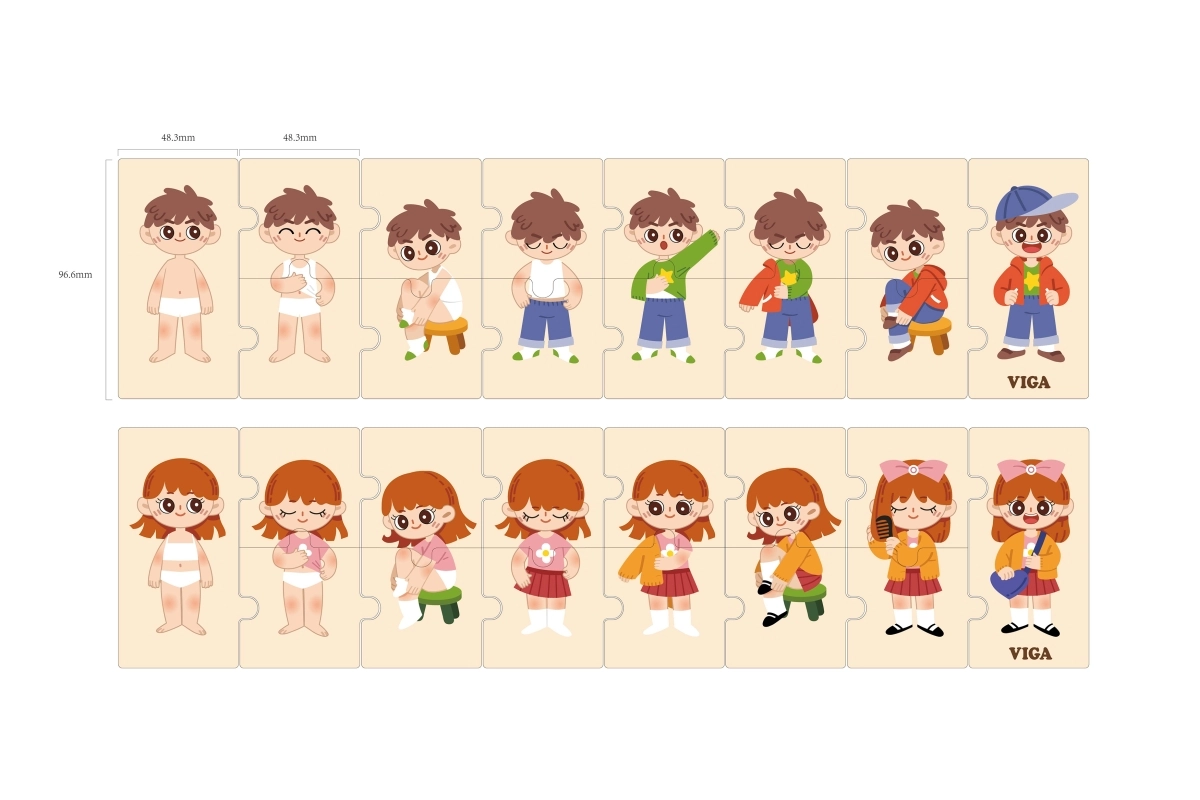 Šī kvalitatīvā koka izglītojošā rotaļlieta māca bērniem pareizu apģērbšanās secību, saliekot savstarpēji saistītus gabalus ar zēna un meitenes attēliem. Katram gabalam ir unikāls motīvs un tas precīzi savienojas ar citiem, tādējādi spēles laikā bērni trenē sakarību uztveri un pacietību.