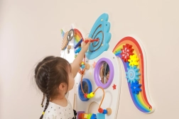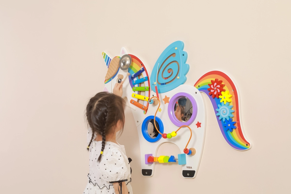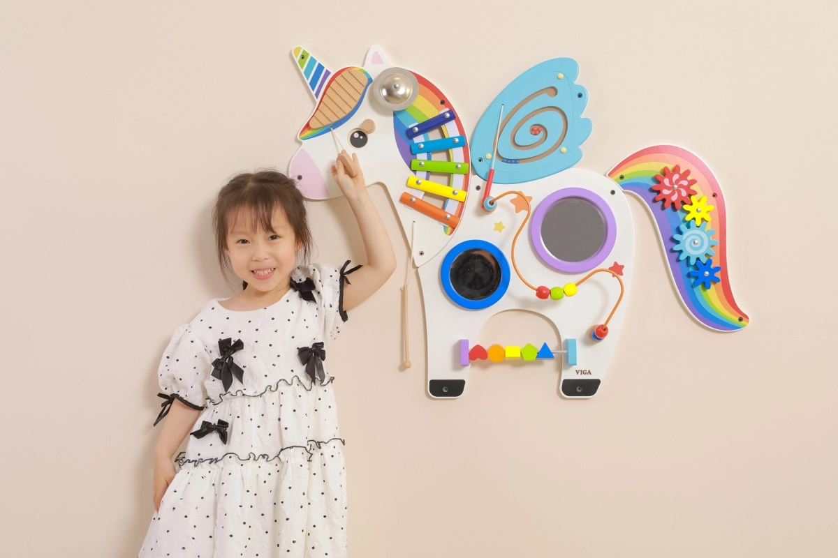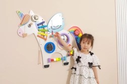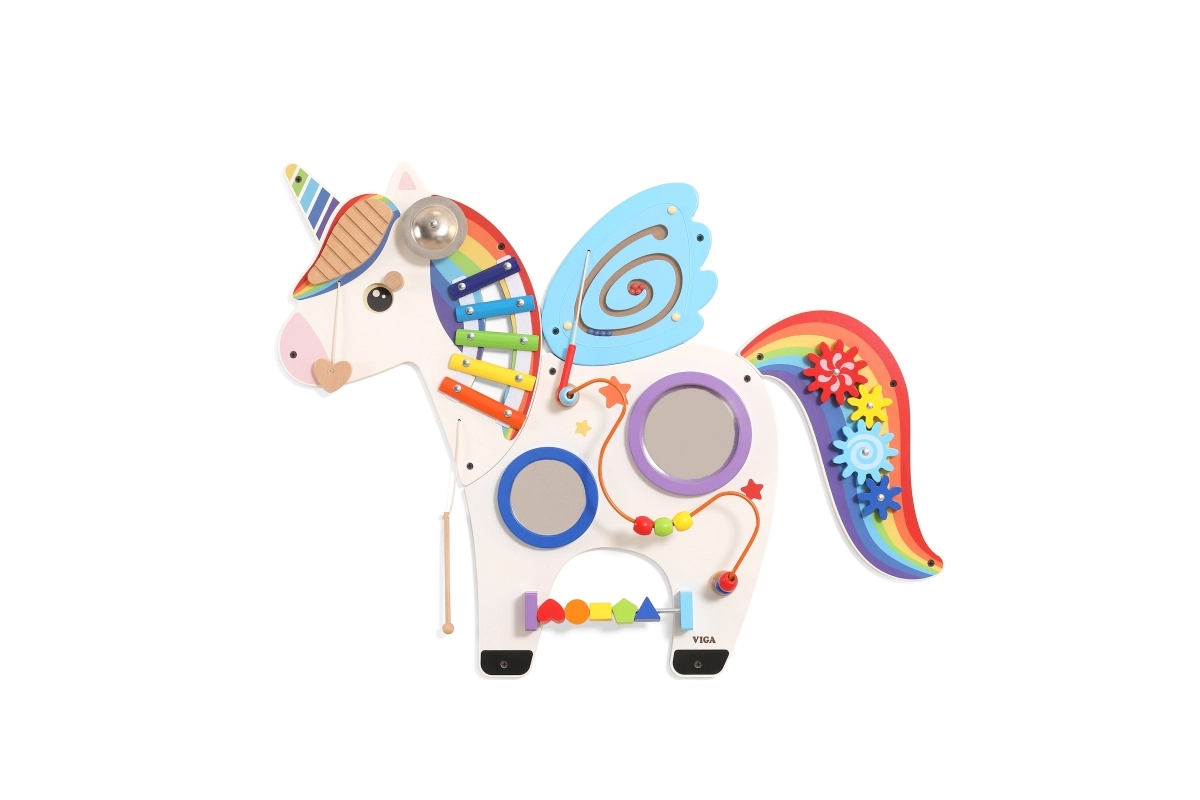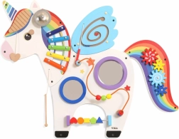 Šis multifunkcionālais sienas tablo vienradža veidolā apvieno muzikālos, taustes un loģiskos elementus vienā pievilcīgā komplektā. Bērni spēlē uz ksilofona, griež zobratus, izmēģina magnētisko labirintu un spoguļus, kā arī trenē krāsas, formas un kustību koordināciju.