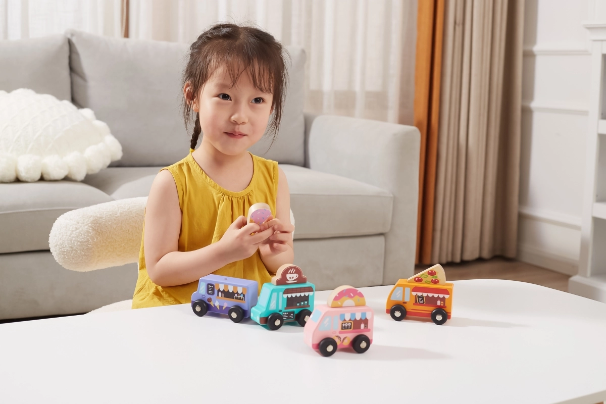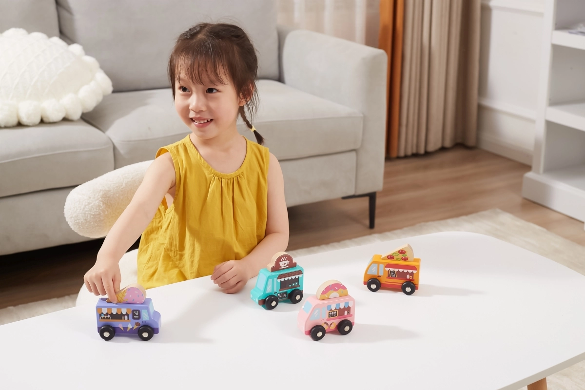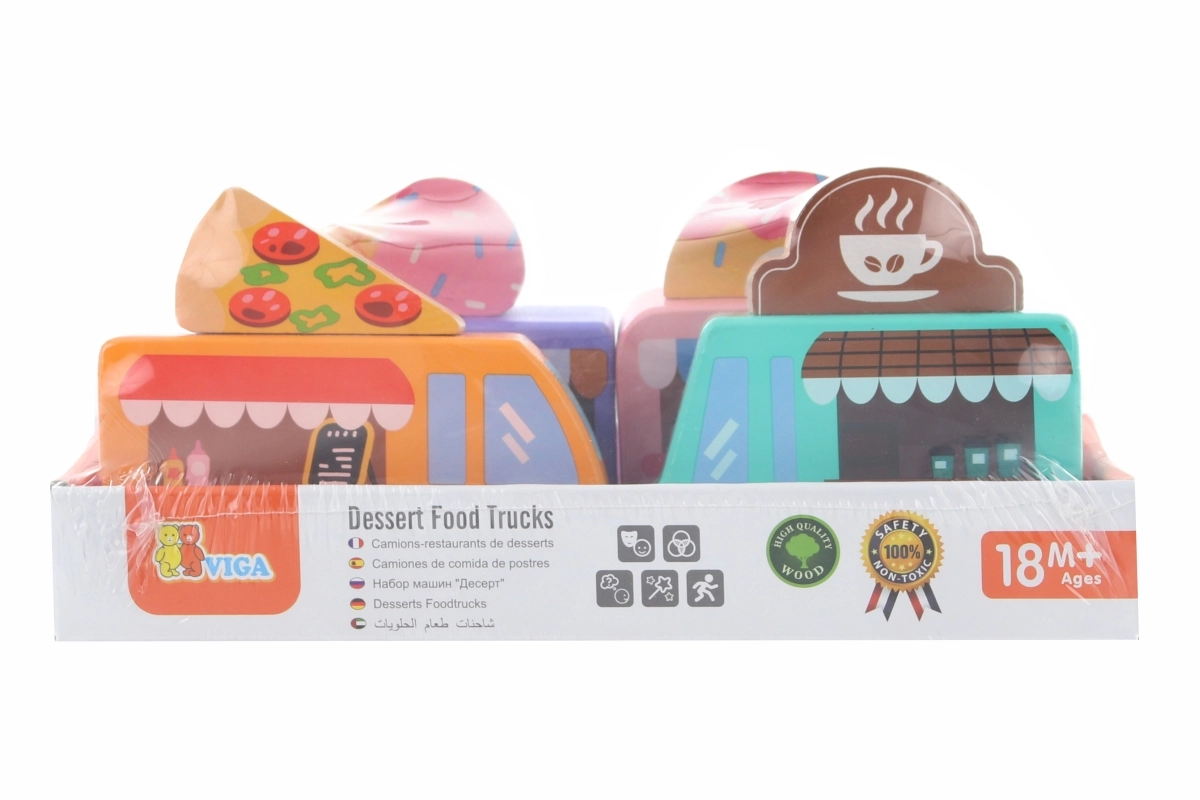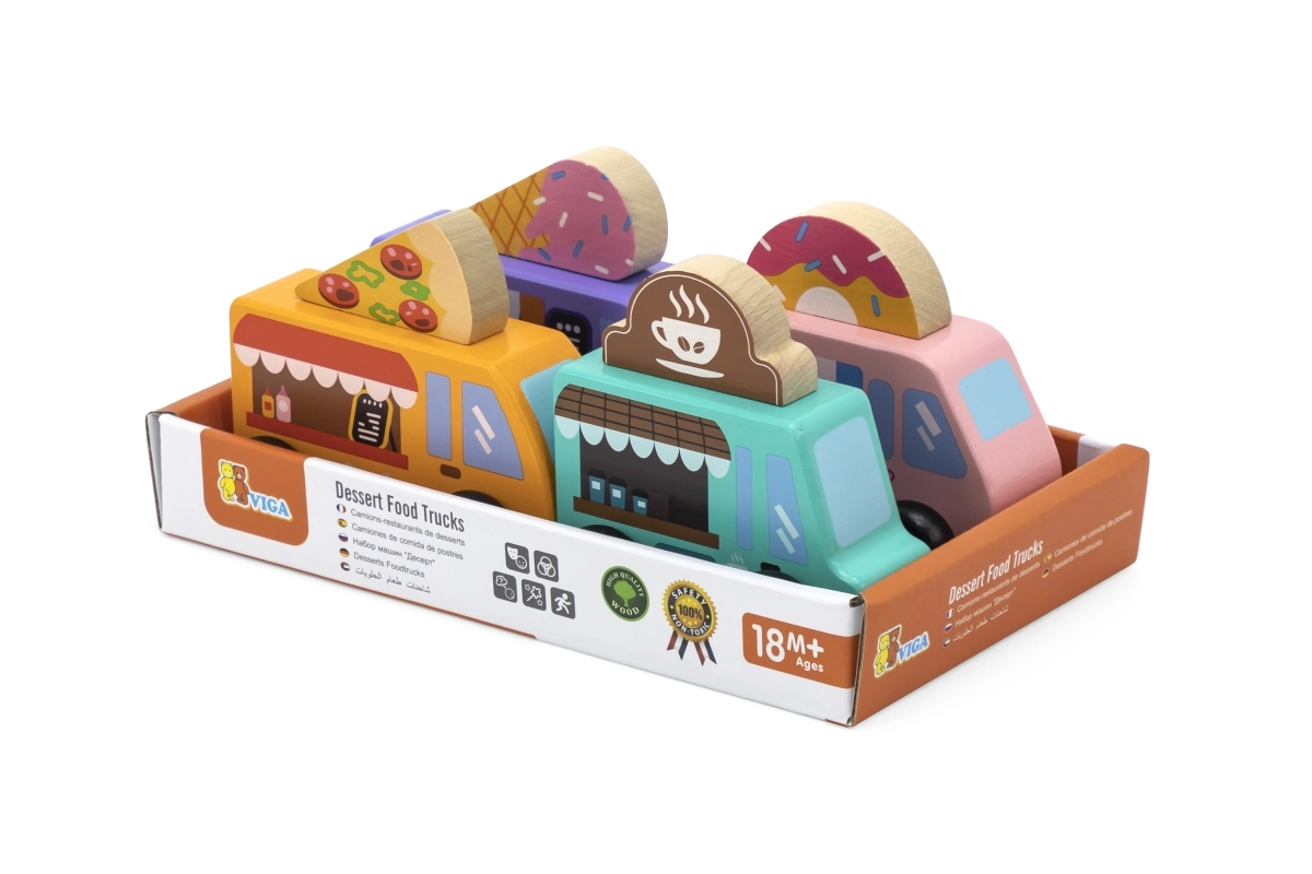 Viga koka food truck komplekts – 4 transportlīdzekļi mazajiem konditoriem