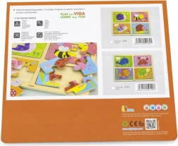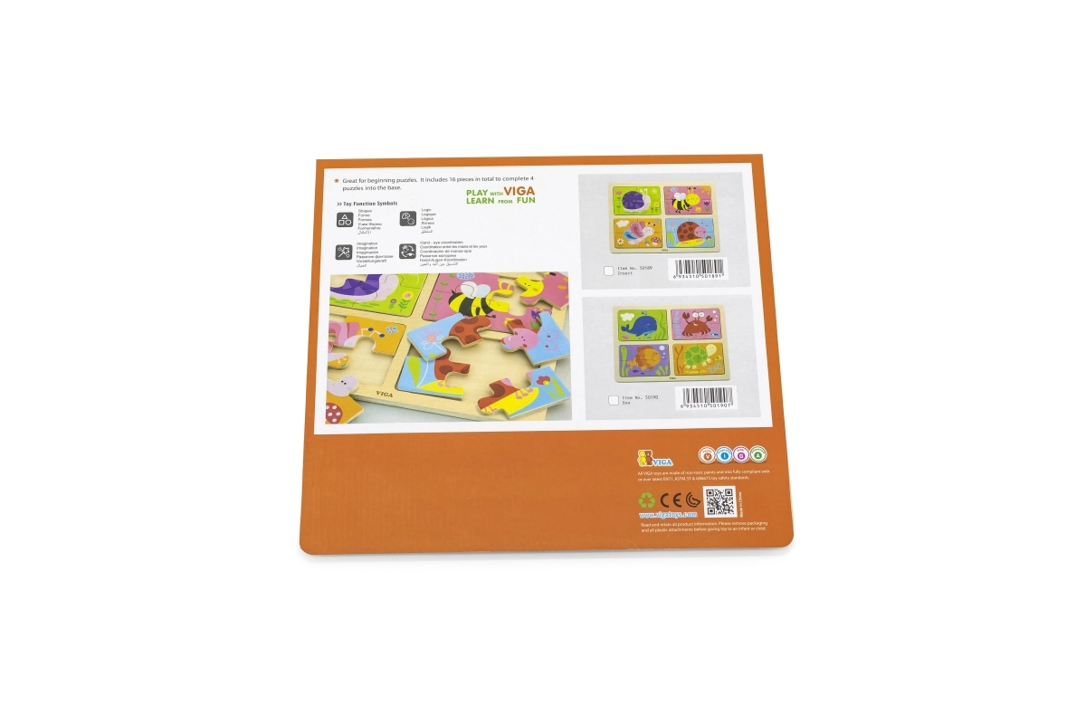 Katrai puzlei ir sava pamatplāksne, kas atvieglo orientēšanos un palīdz bērniem ātrāk gūt panākumus. Izturīgās koka detaļas ir patīkamas taustei, ērti satveramas un iztur biežu lietošanu.
