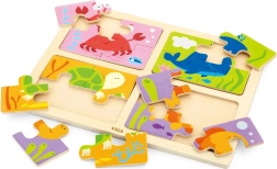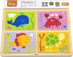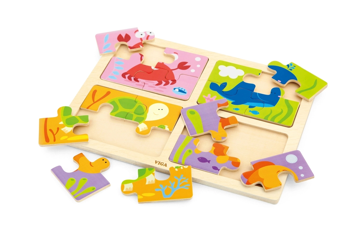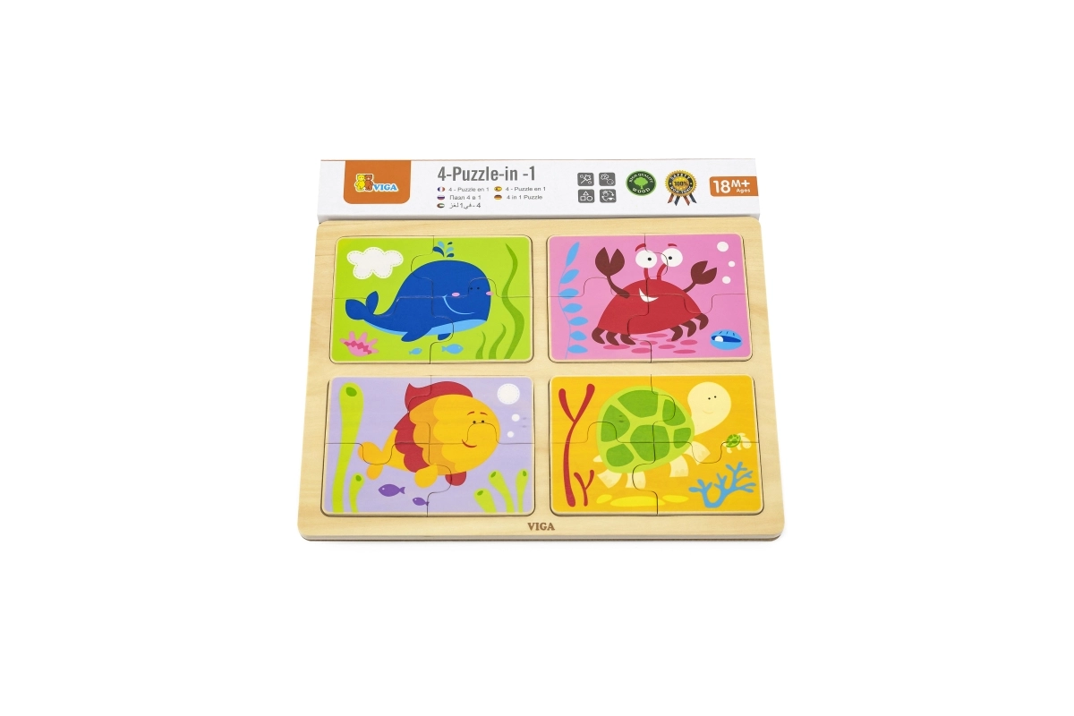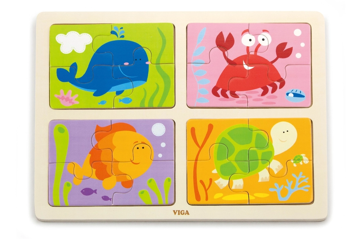 Šajā komplektā ir četras vienkāršas koka puzles ar mīlīgiem jūras dzīvnieku motīviem. Pateicoties nelielam detaļu skaitam, tās ir lieliski piemērotas bērnu pirmajai iepazīšanai ar puzlēm, attīsta roku–acu koordināciju un māca pacietību.