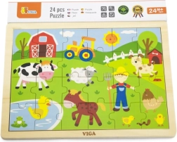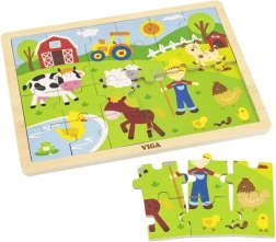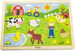 Koka puzle ar fermas motīvu attēlo dažādus lauku dzīves aspektus, tostarp dzīvniekus un zemnieku, kas ir īpaši pievilcīgi bērniem.