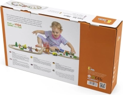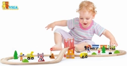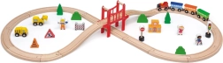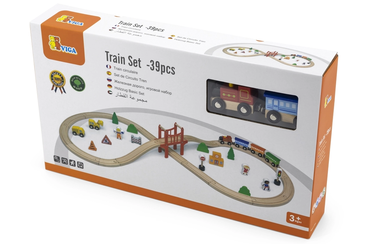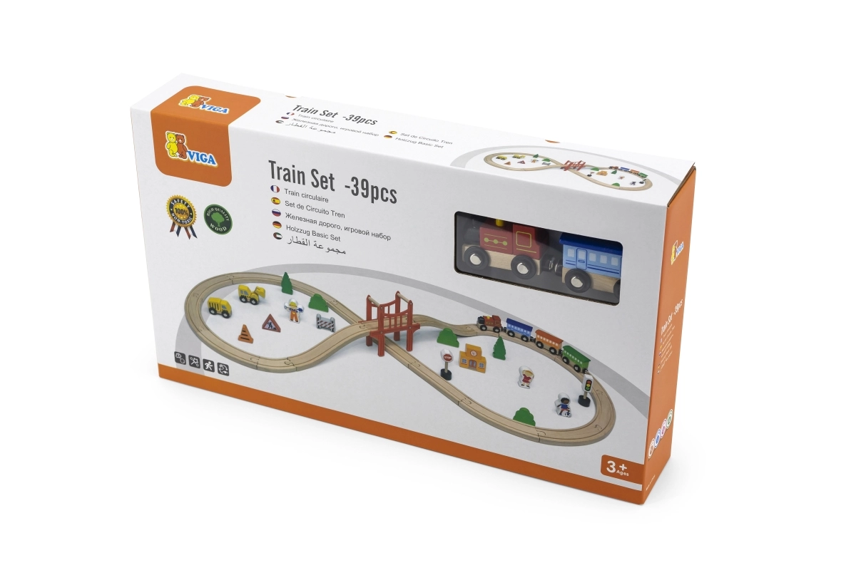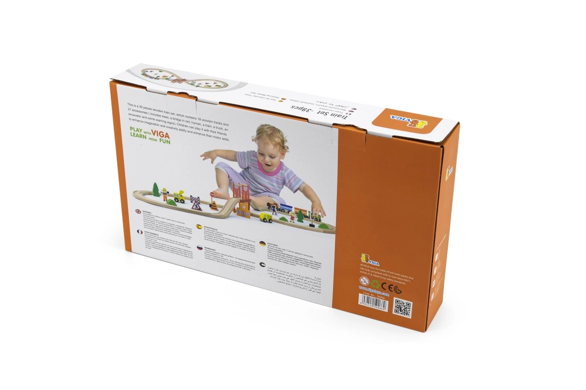 Koka vilciena sliežu komplekts piedāvā pilnu 39 gabalu komplektāciju, kas ļauj veidot neskaitāmas konfigurācijas un attīstīt bērna fantāziju.