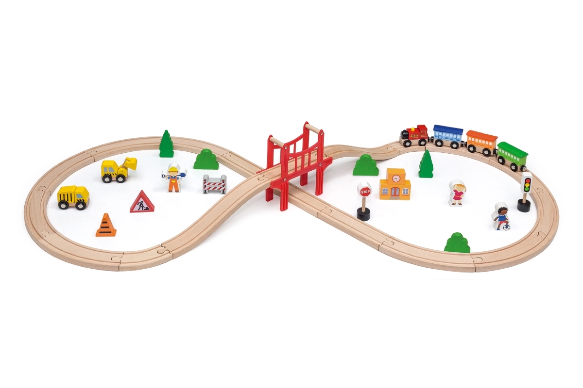 Koka vilciena sliežu komplekts astoņnieka formā ir lielisks palīgs radošuma un motorikas prasmju attīstīšanai bērniem no 3 gadu vecuma. Komplektā ir kopā 39 detaļas, tostarp sliedes, tilts un citi piederumi.