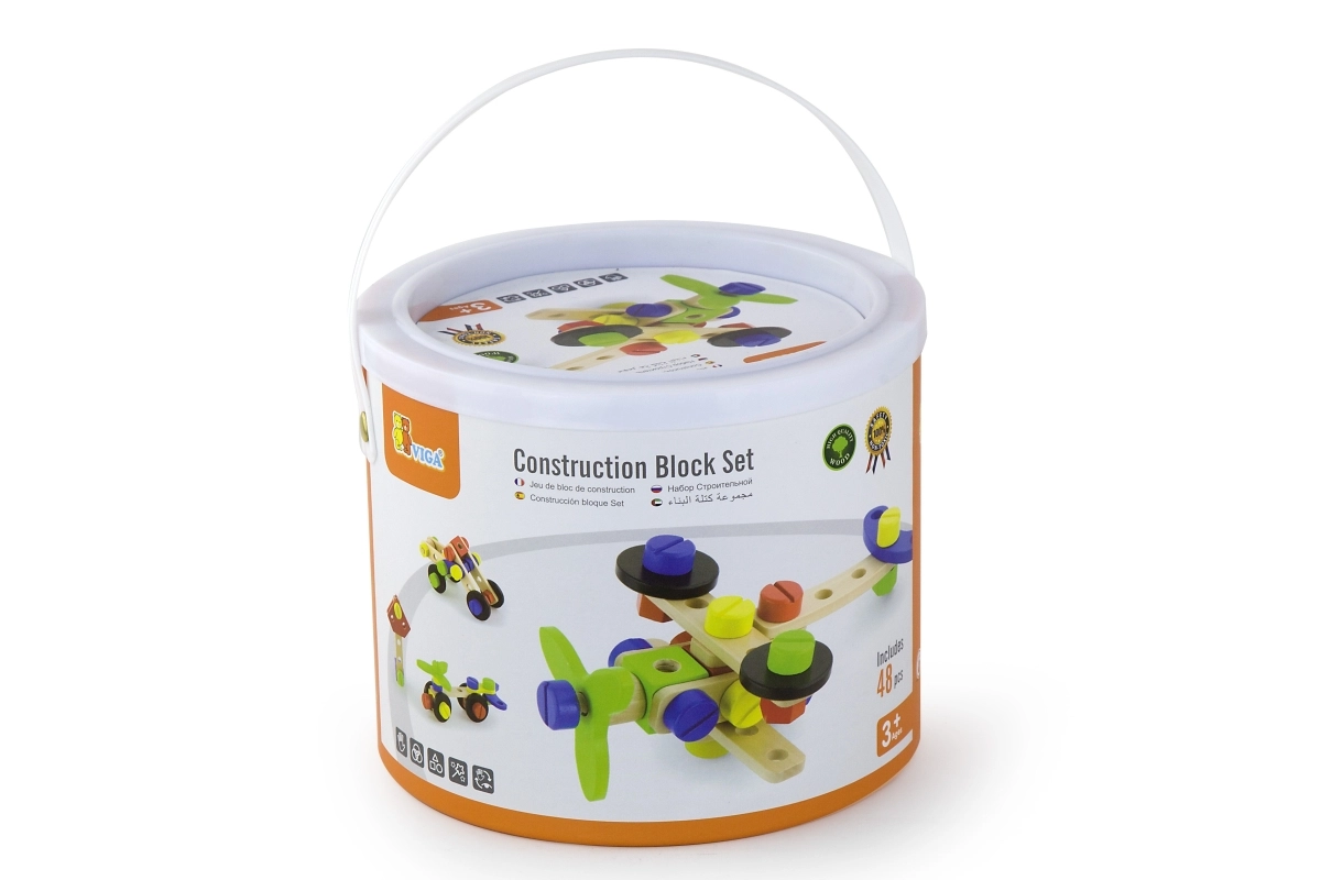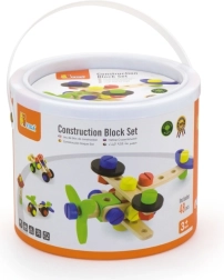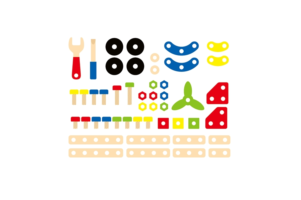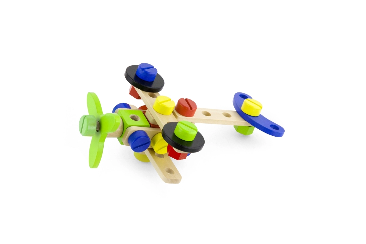 Šis koka konstruktora komplekts ir lieliska izvēle pirmajai tehniskajai būvēšanai. Bērni var veidot savus darbus pēc fantāzijas vai iedvesmoties no pievienotās brošūras ar attēlu pamācībām. Kompaktais spainītis ar rokturi atvieglo pārnēsāšanu un glabāšanu, tāpēc komplekts vienmēr ir pa rokai un detaļas nepazūd.