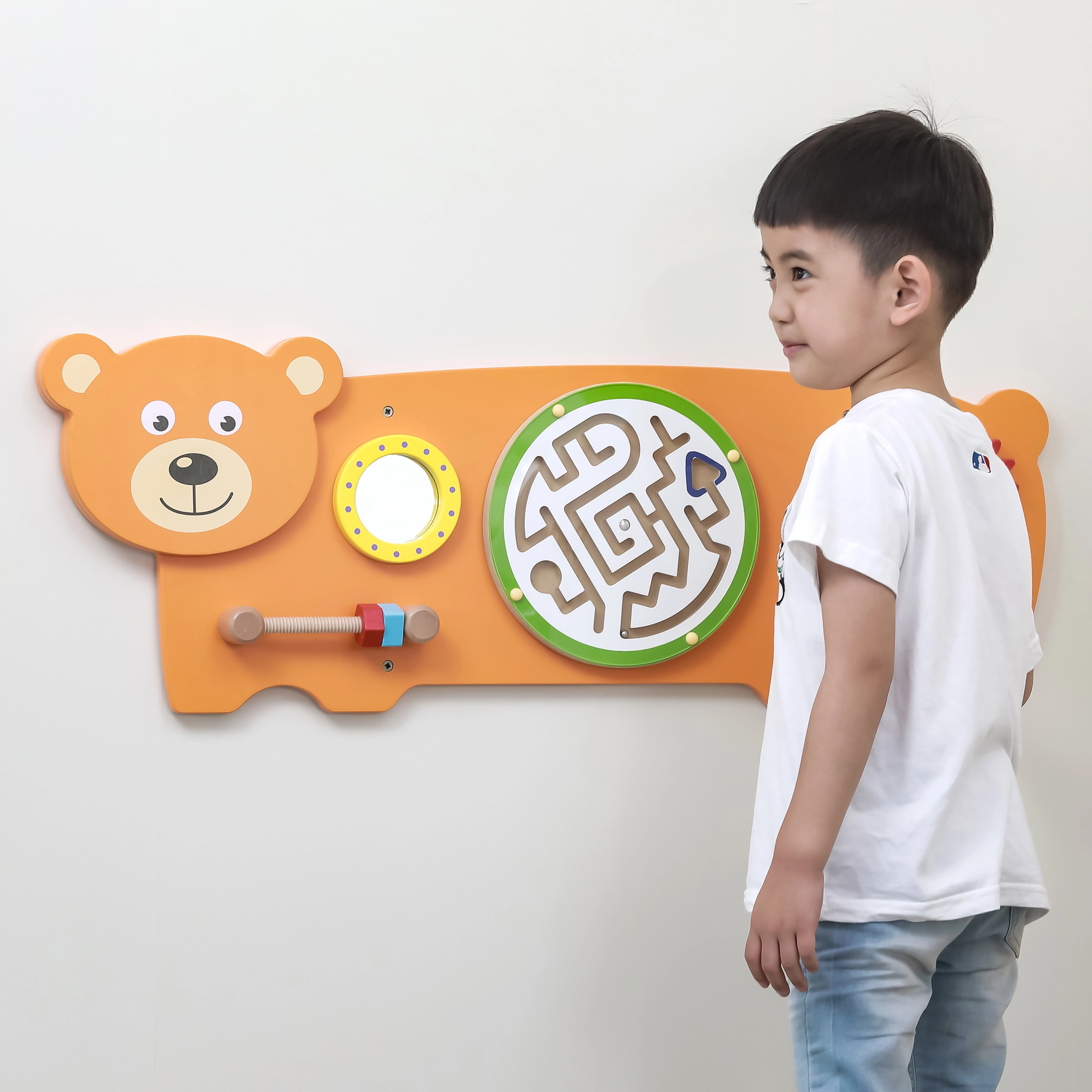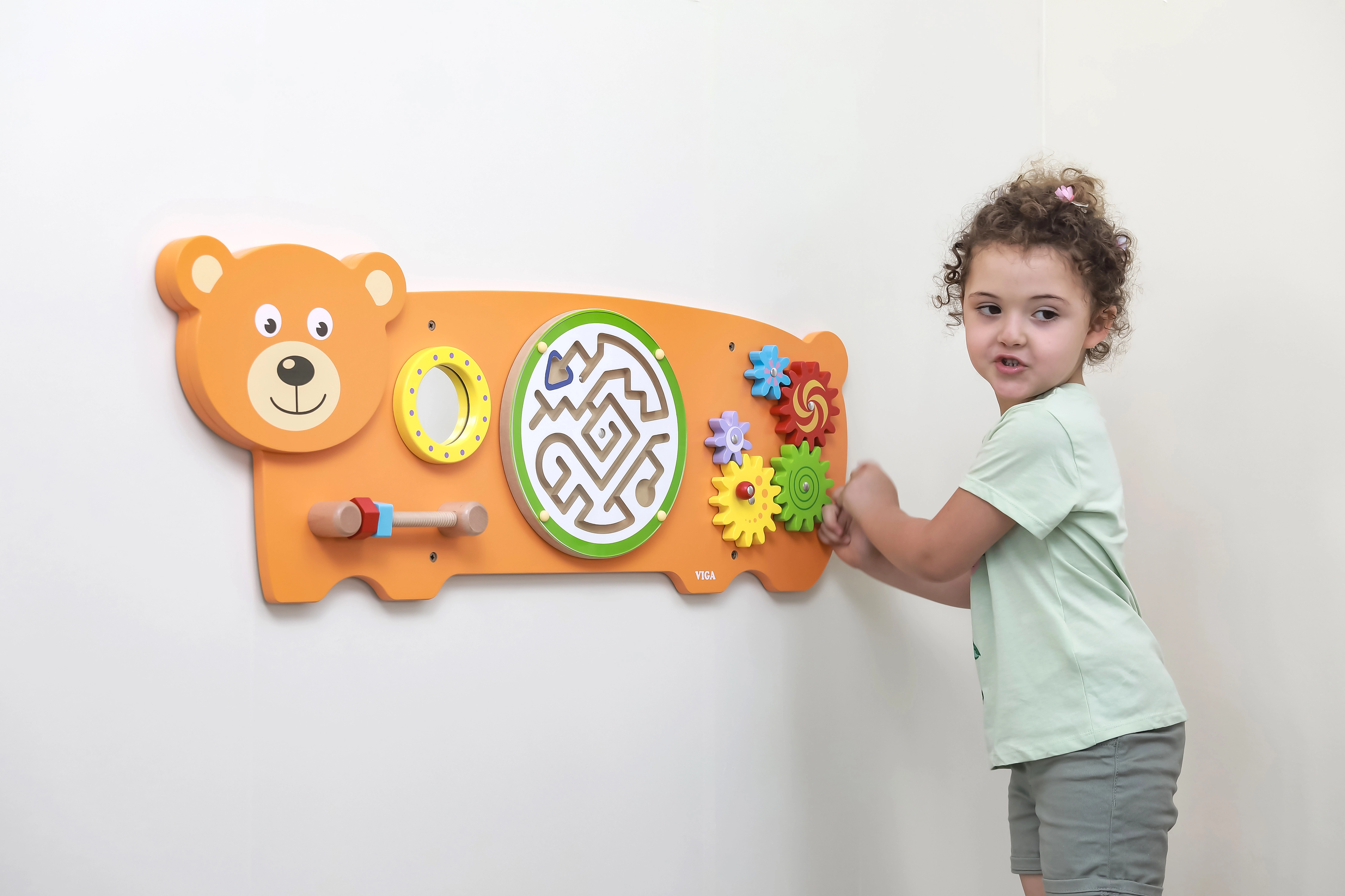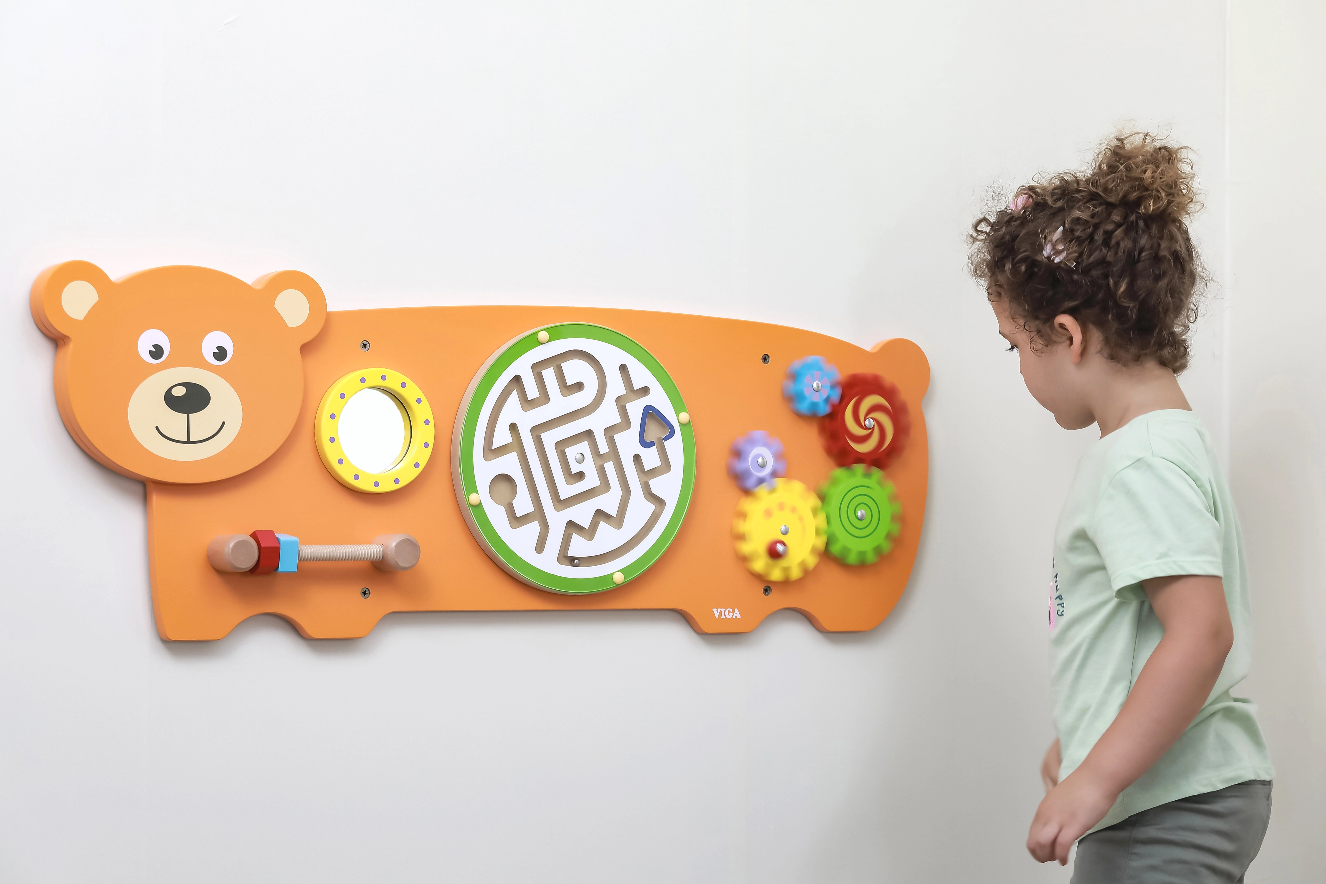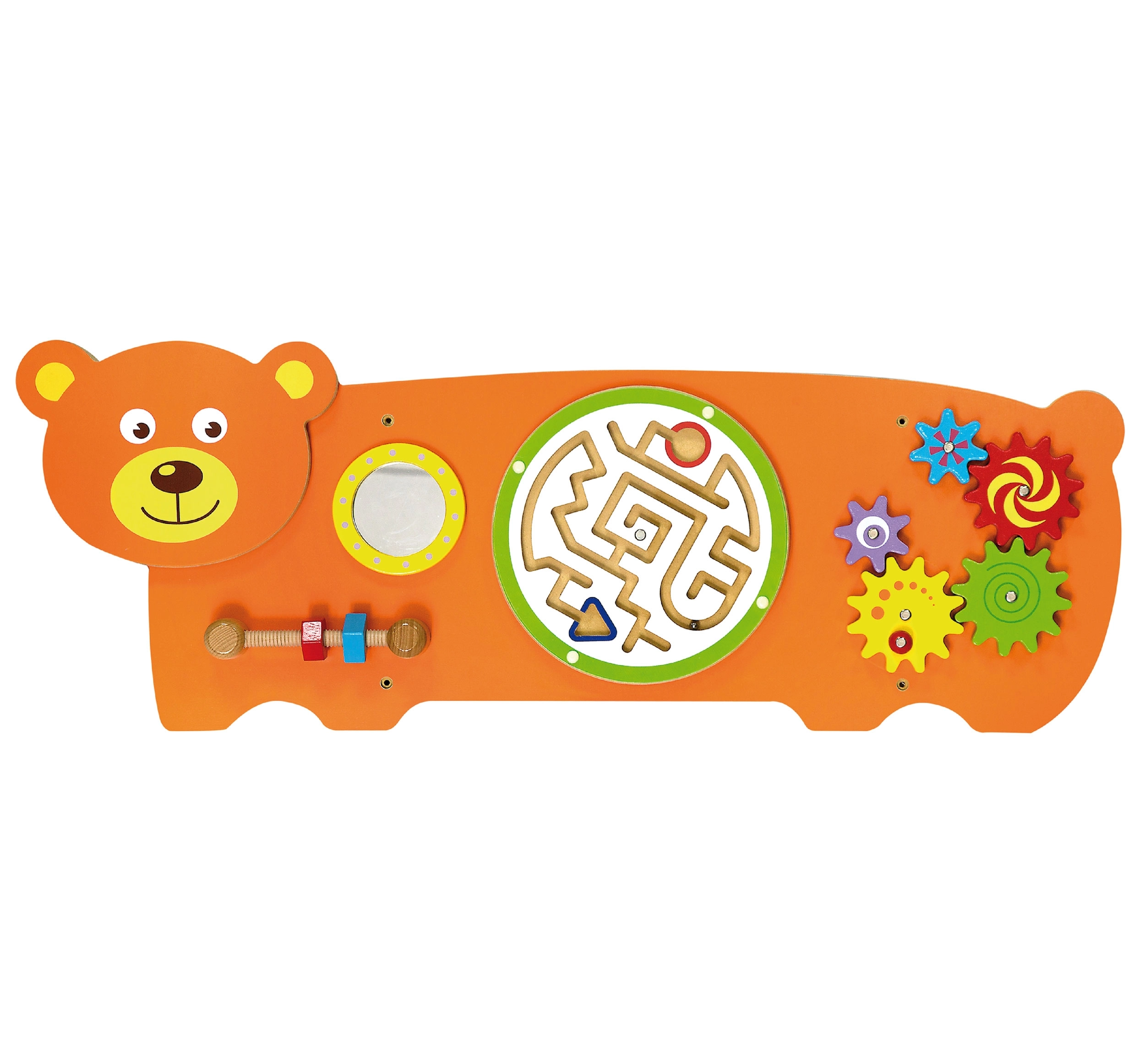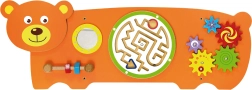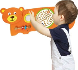 Maņu tāfele Lācītis veidota pēc Montessori principiem, dabiski motivējot bērnus atklāt un trenēt prasmes. Tā piedāvā vairākas aktivitātes: zobratu griešanu, lodītes vadīšanu labirintā, vērošanu drošajā spogulītī un satvēriena treniņu ar skrūvītēm uz vītnes. Pateicoties robustajai koka konstrukcijai un iespējamai sienas montāžai, tā lieliski piemērota bērnu istabām, rotaļu telpām un bērnudārziem.