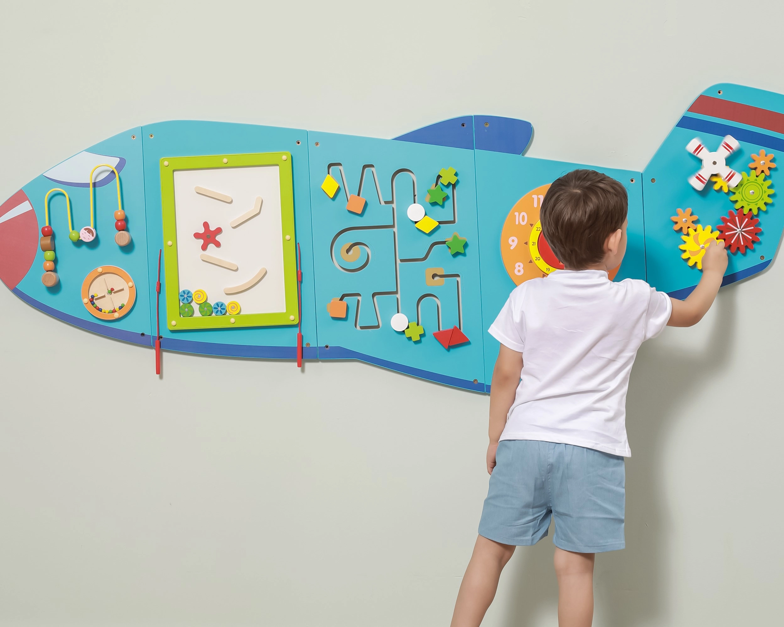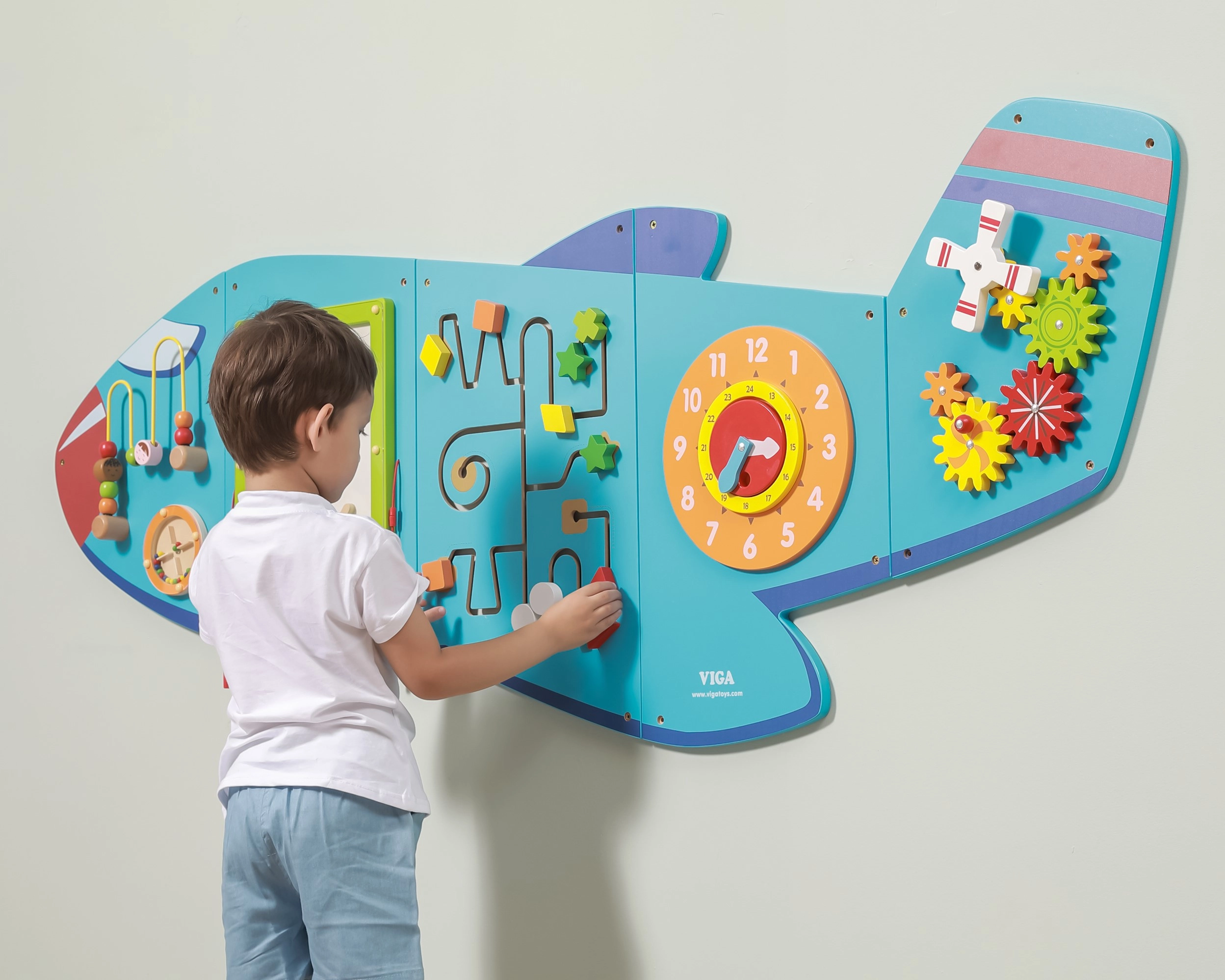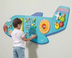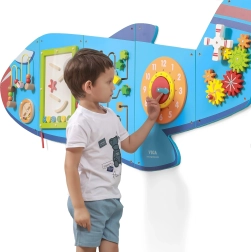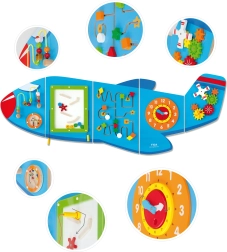 Koka sienas tāfele Lidmašīna no VIGA ir daudzfunkcionāla rotaļlieta, kas sastāv no piecām daļām, kuras kopā veido lidmašīnas formu. Katrs elements piedāvā atšķirīgu aktivitāšu veidu jautrai prasmju attīstīšanai: