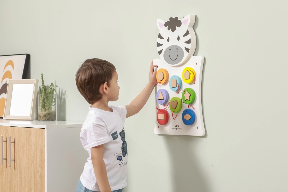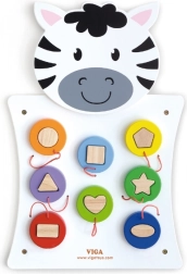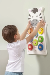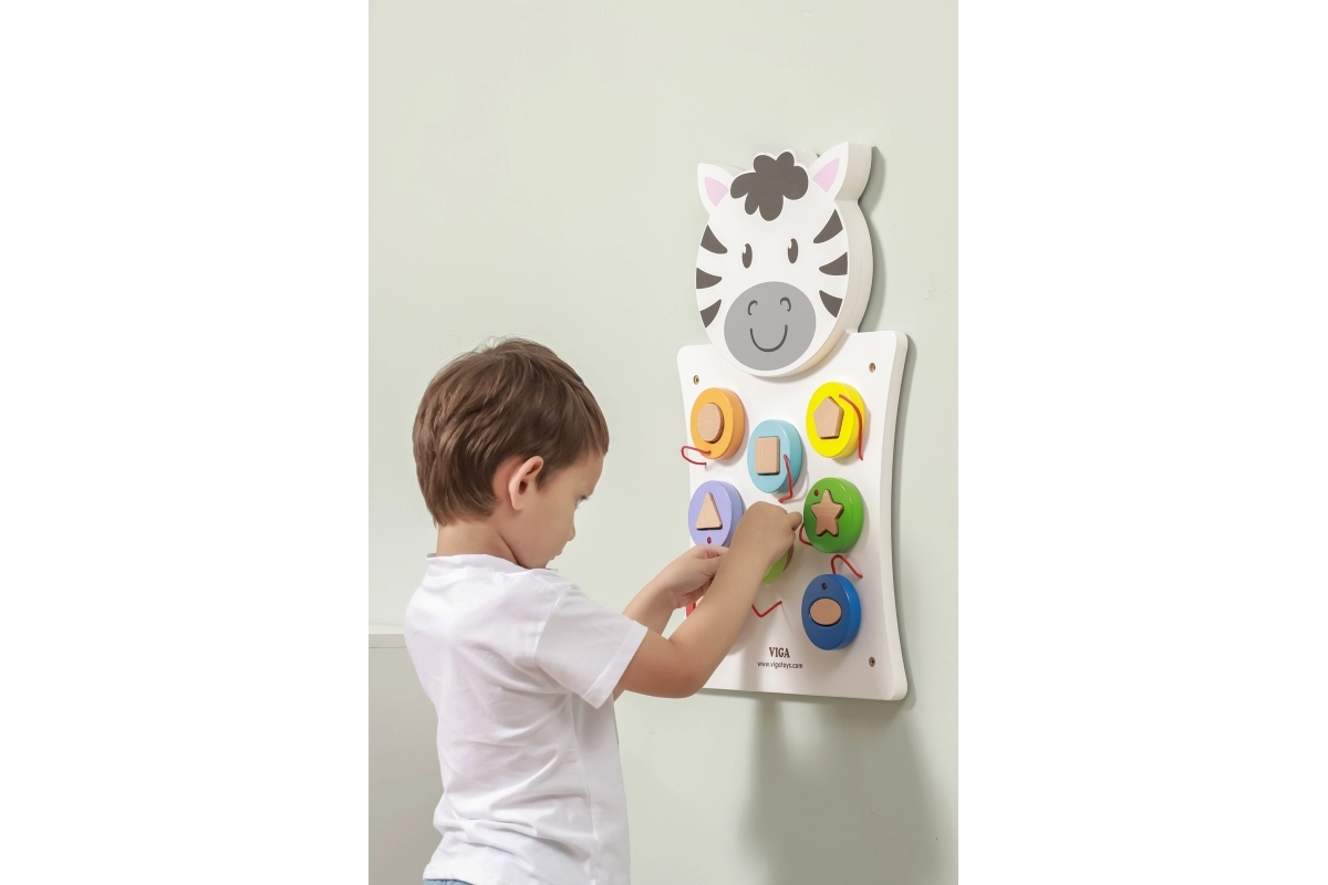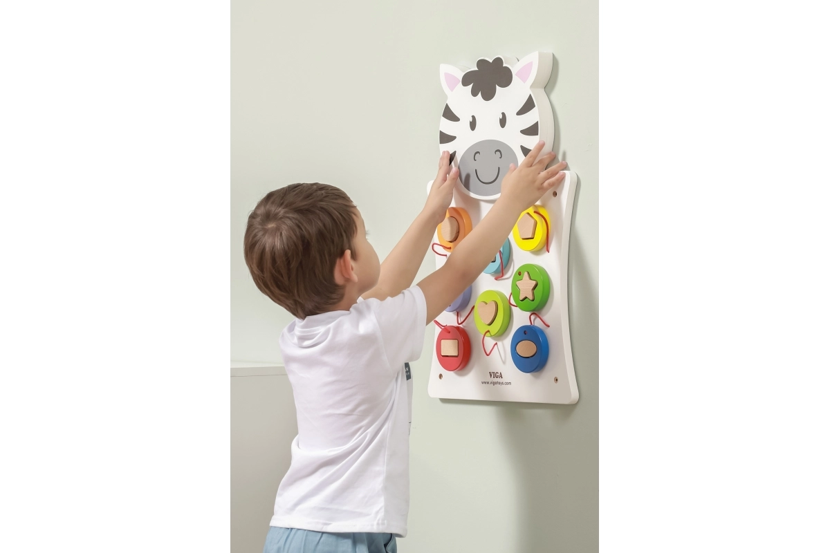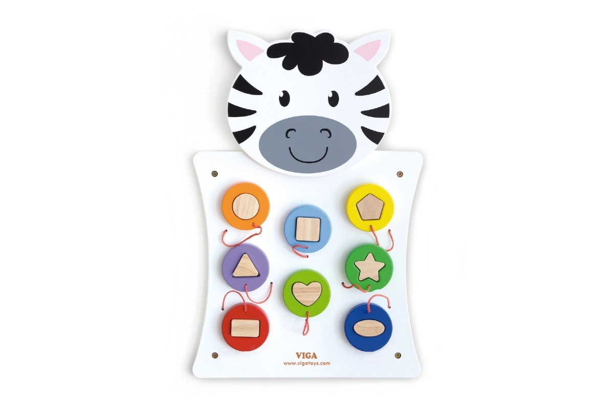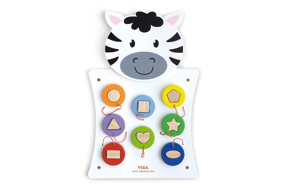 Koka sienas spēle Zebra no VIGA bērniem piedāvā aizraujošu un radošu rotaļu veidu, kurā ar šķirotāja un krāsainu koka detaļu palīdzību apgūst formu un krāsu atpazīšanu.