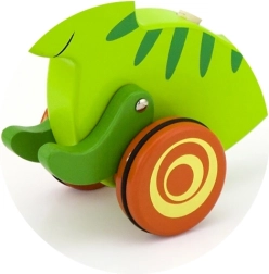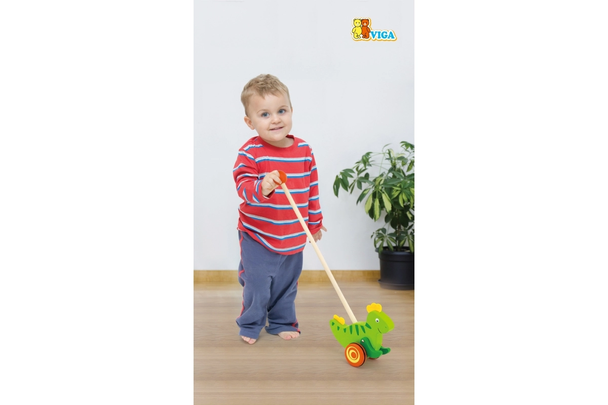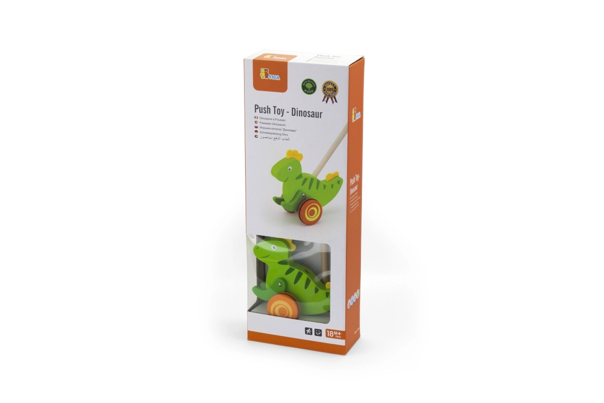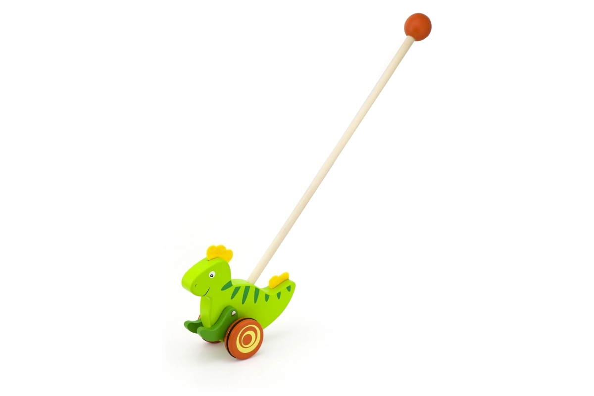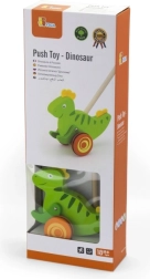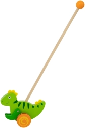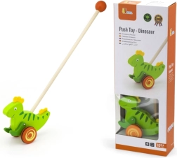 Koka stumjamā rotaļlieta Dinozaurs ir klasiskā rotaļlieta, kas paredzēta bērniem, kuri sāk kustēties. Šis izturīgais piederums ir aprīkots ar riteņiem un pret-slīdes uzlikām, kas aizsargā grīdu un atvieglo pārvietošanos. Zaļais dinozaurs enerģiski kustina rokas stumšanas laikā, piesaistot uzmanību un motivējot bērnu turpināt kustību.