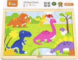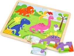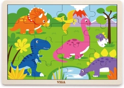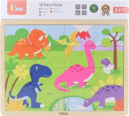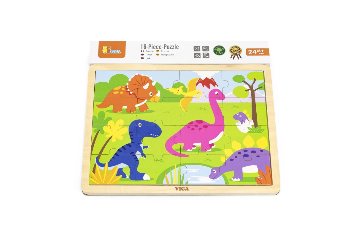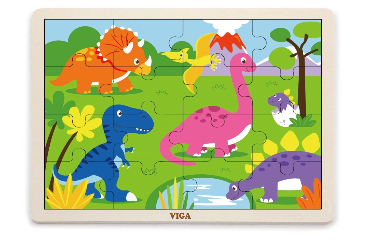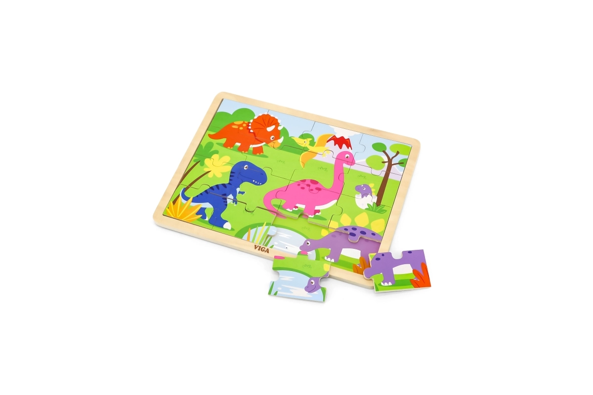 Atklājiet kvalitatīvo VIGA koka puzli ar dinozauriem, kas bērniem sniedz pirmo prieku no likšanas. 16 gabaliņi trenē sīko motoriku, acu–roku koordināciju un loģisko domāšanu. Daļas var ievietot koka pamatnē ar rāmi vai likt attēlu arī bez rāmja. Saliktās puzles izmērs ir apm. 27,5 × 20 cm, piemērota no 24 mēnešiem.