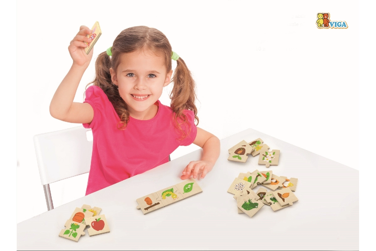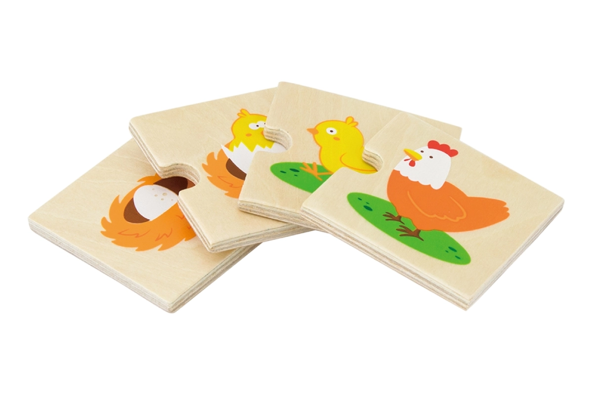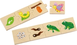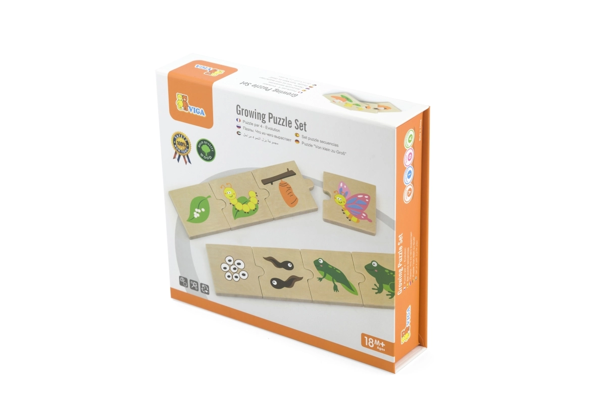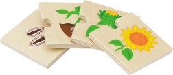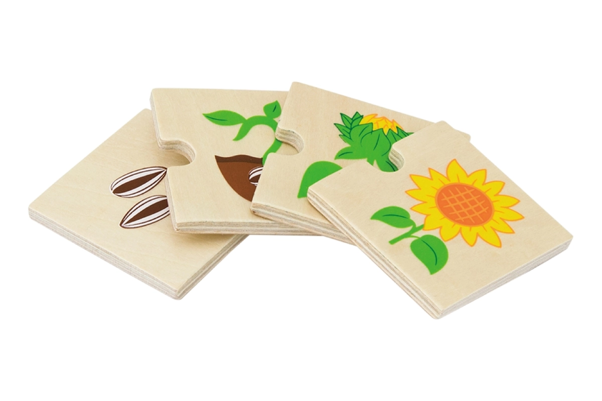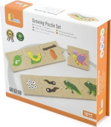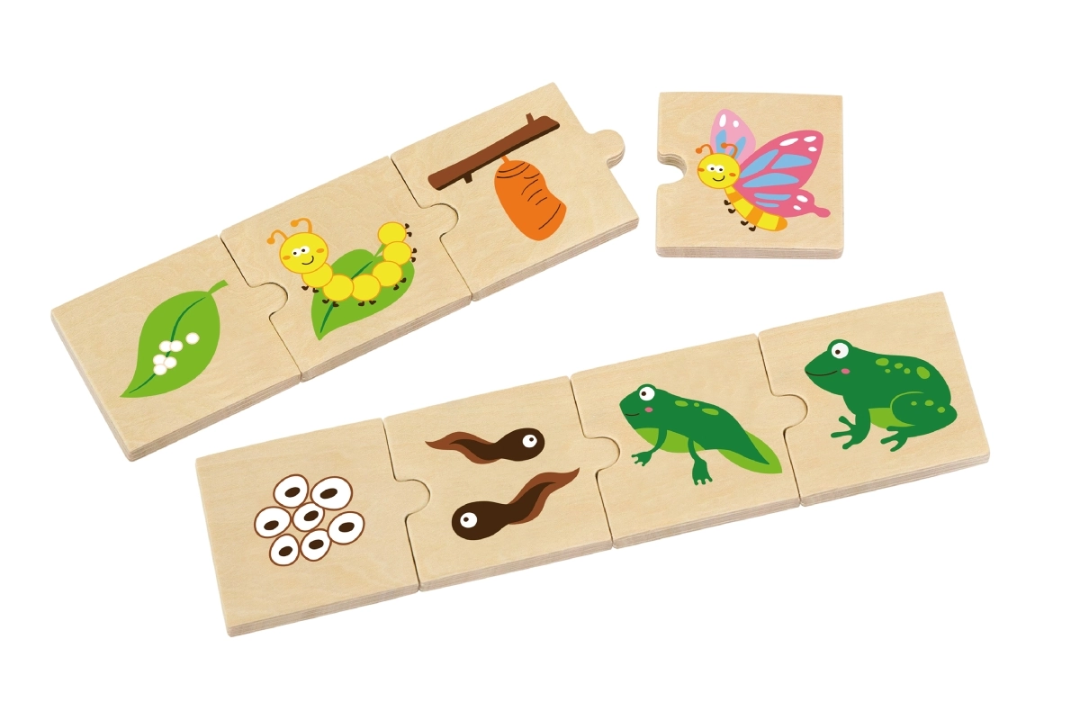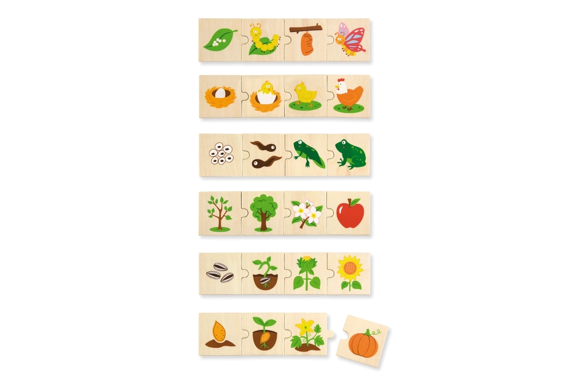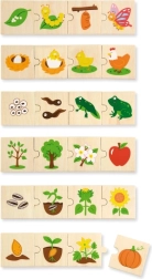 Šis koka “augošo” pužļu komplekts māca bērniem izprast dzīves ciklus gan dzīvniekiem, gan augiem – no sēklas vai olas līdz pieaugušam stāvoklim. Katru motīvu veido posmu secība, kas loģiski savienojas, tādējādi dabiski trenējot sīko motoriku, spēju uztvert sakarības un acu–roku koordināciju.