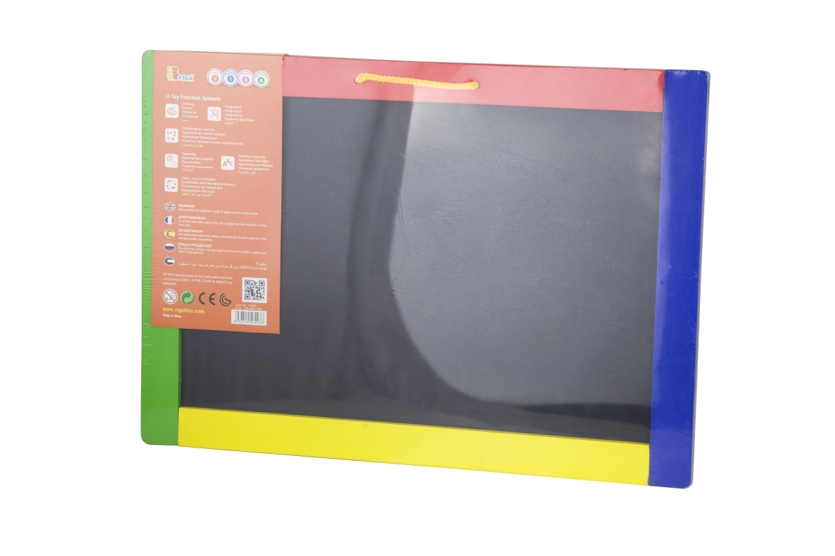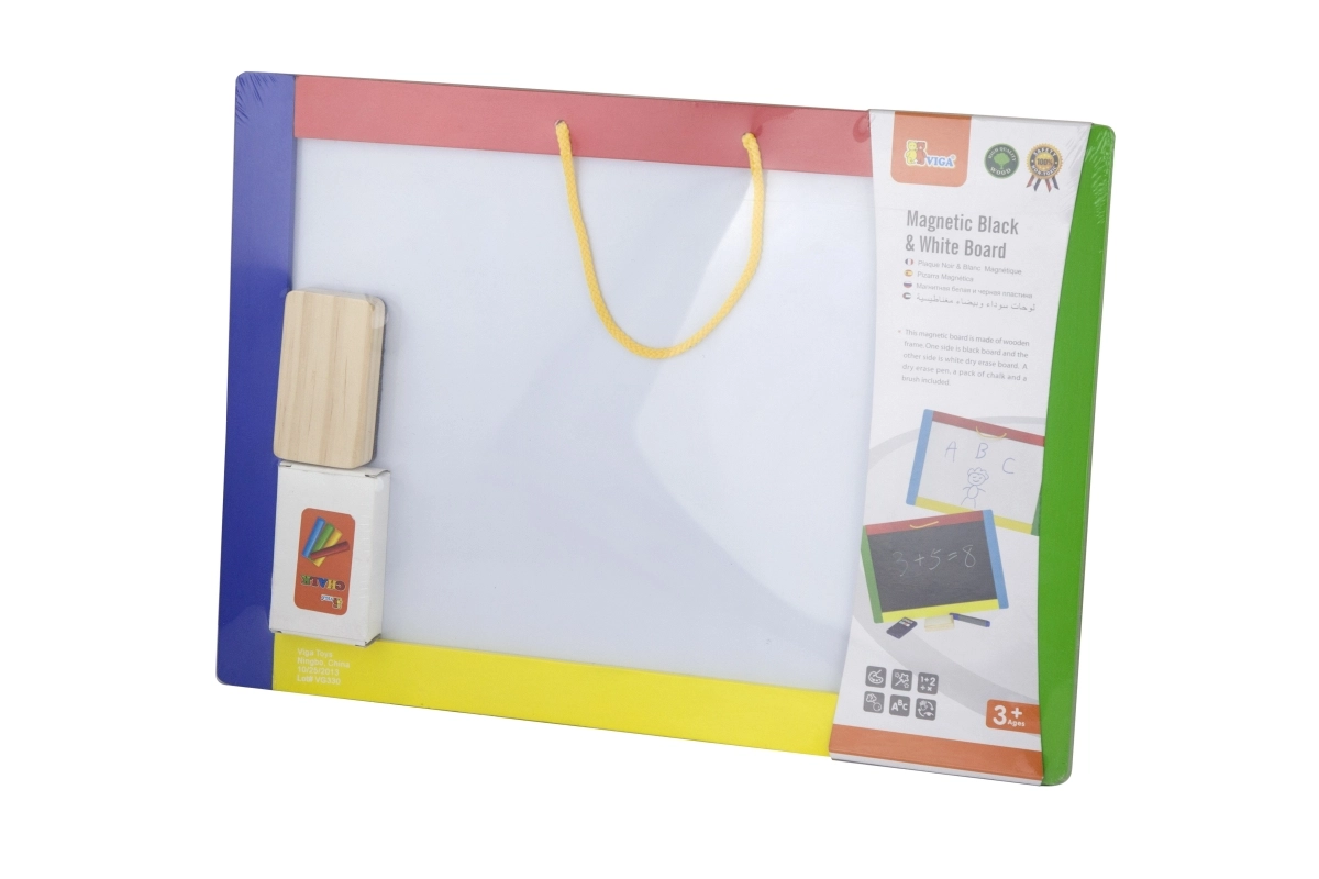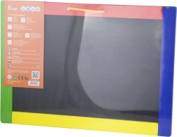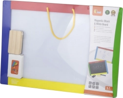 Šī universālā tāfele apvieno divas radošas virsmas vienā – melna magnētiskā puse krītiņiem un balta noslaukāma puse flomāsteram. Bērni var rakstīt, zīmēt un trenēt burtus un ciparus; pie melnās puses viegli pielikt magnētiņus. Komplektā atradīsiet visu tūlītējai lietošanai: 4 krītiņus, noslaukāmu flomāsteru un sūklīti.