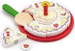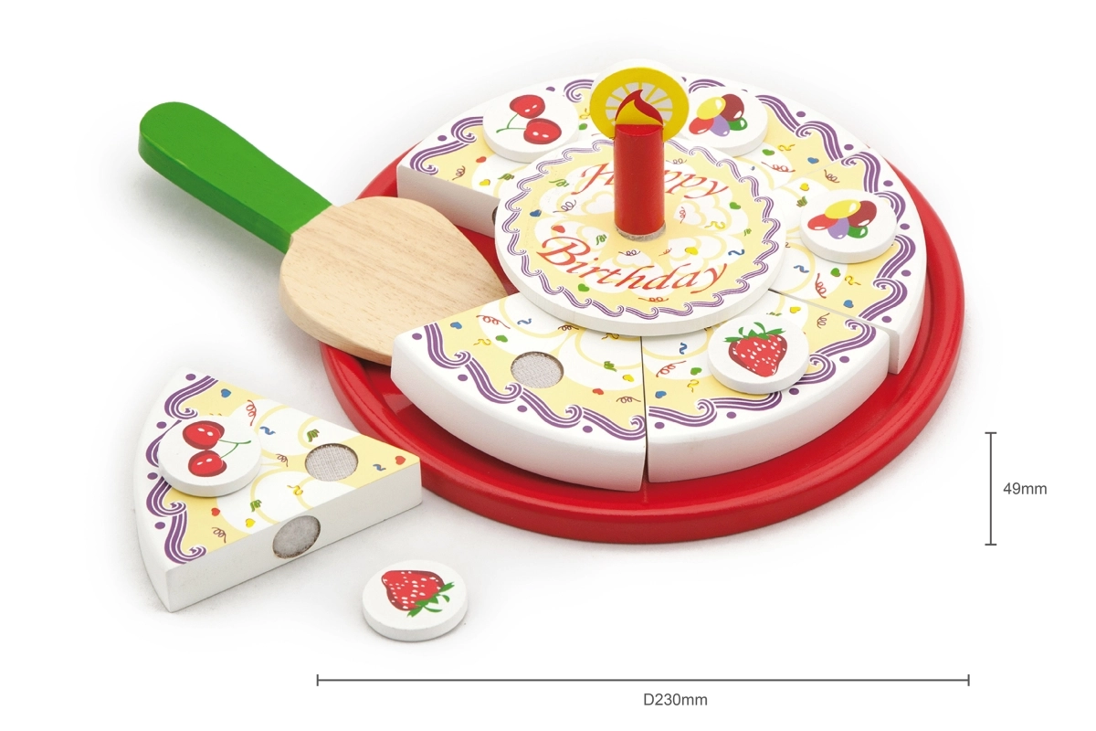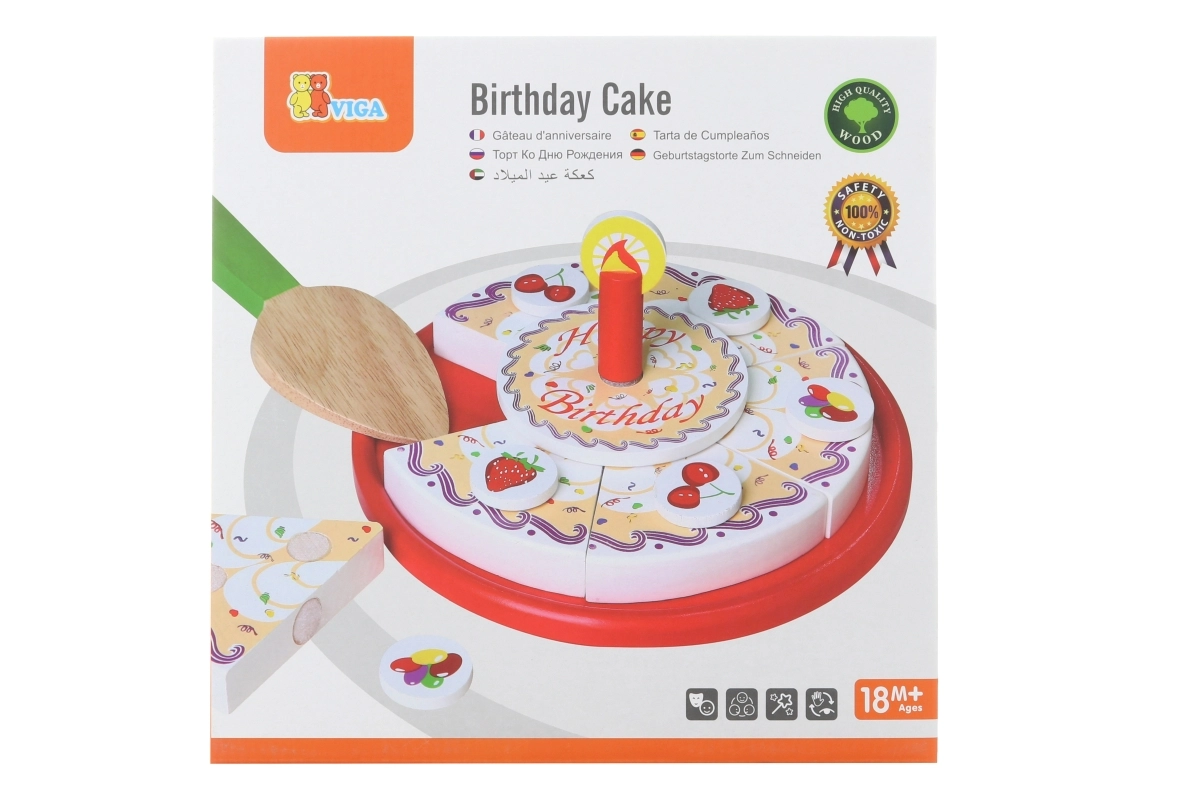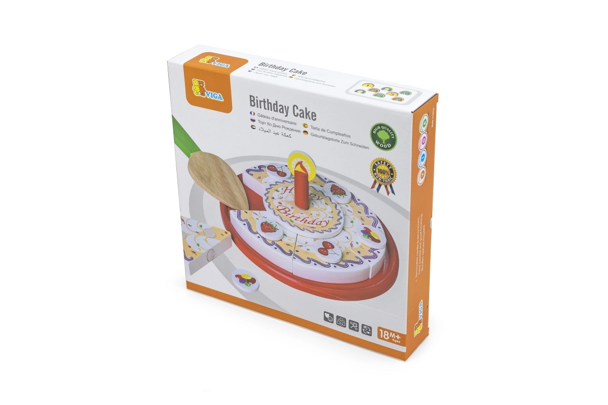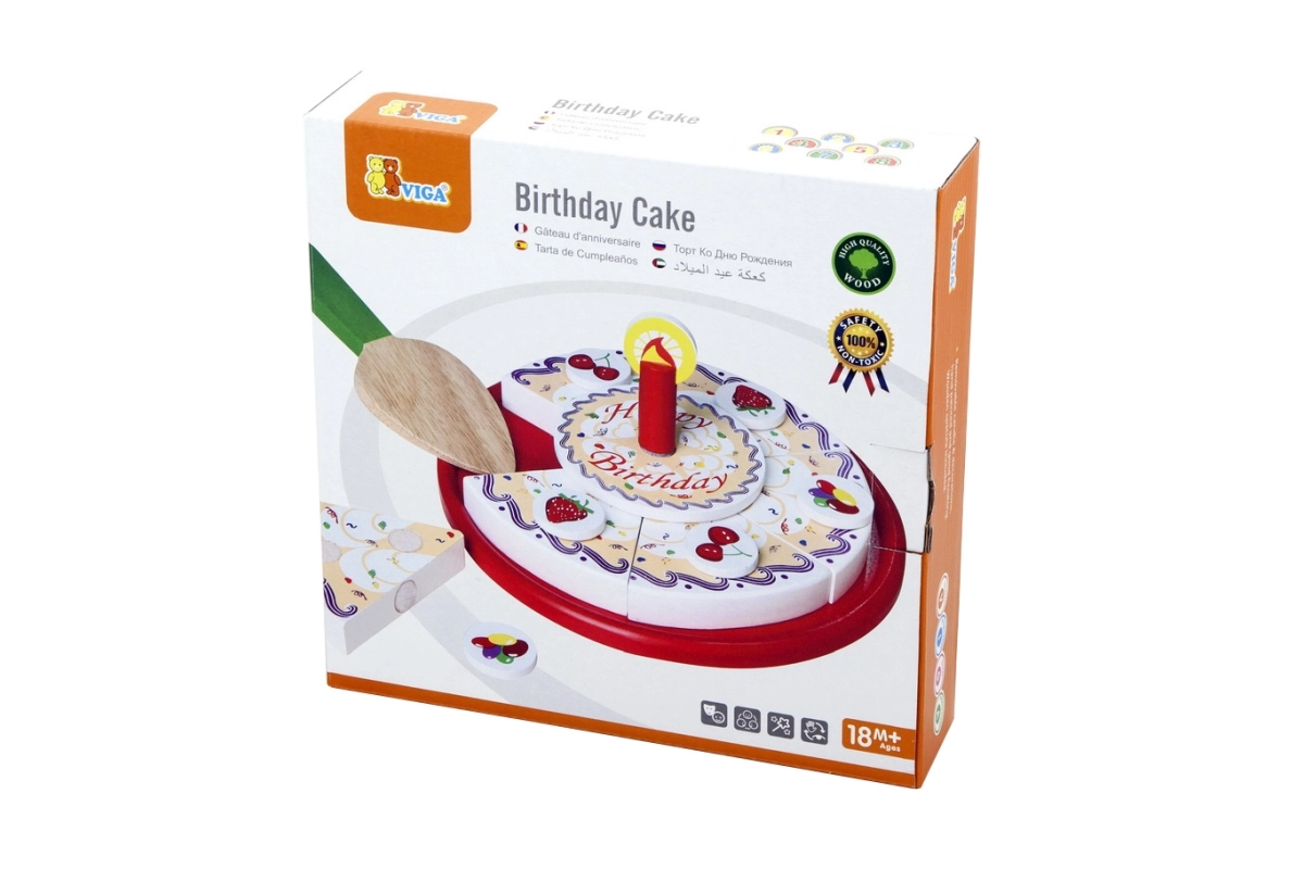 Stilīga koka griežamā kūka no zīmola VIGA bērniem no 18 mēnešiem sniedz stundām ilgu fantāzijas spēli. Krāsainās šķēles viegli “tiek sagrieztas” un atkal saliktas kopā, attīstot sīko motoriku, acu–roku koordināciju un sadarbību dzimšanas dienas svinību rotaļās.