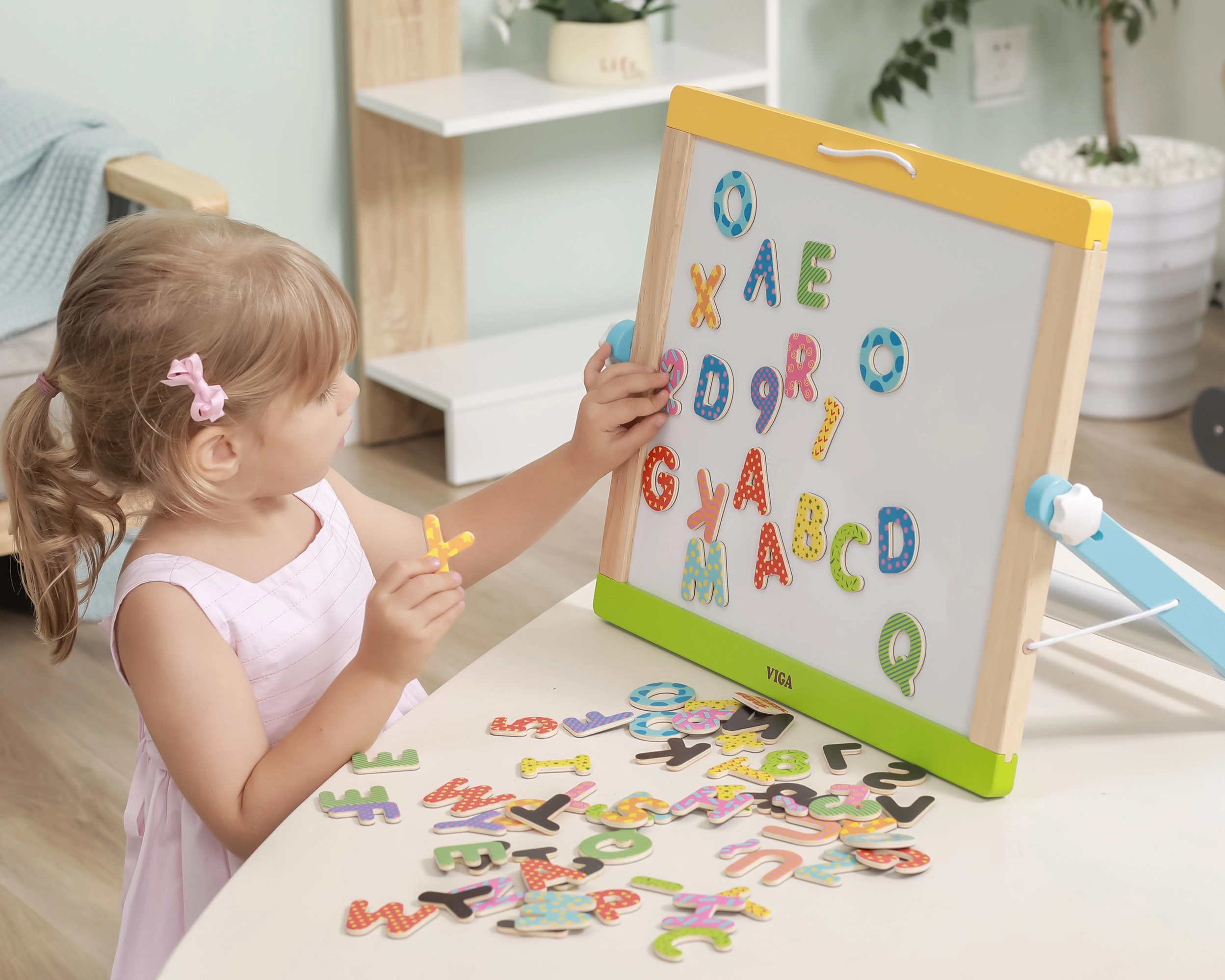 VIGA koka mācību komplekts apvieno rotaļīgas krāsas un pārdomātu dizainu, lai atbalstītu bērnu dabisko zinātkāri. Magnētiskie burti A–Z, cipari 0–9 un matemātiskie simboli ļauj veidot pirmos vārdus, teikumus un vienkāršus piemērus. Ideāli mājmācībai, bērnudārzam un pirmajai klasei.