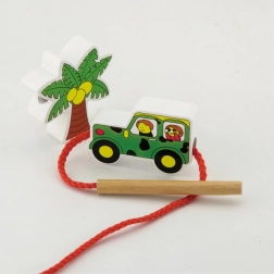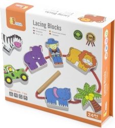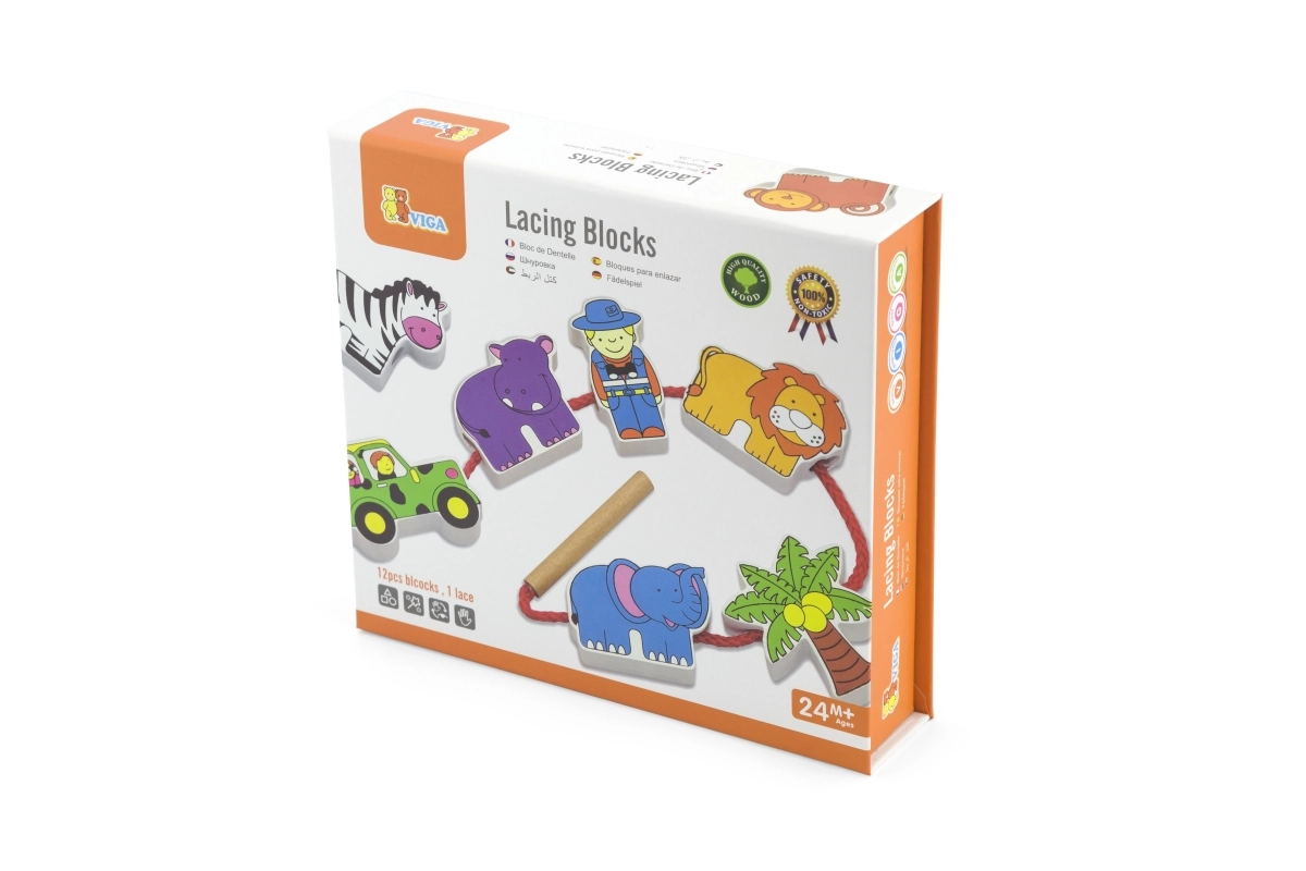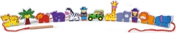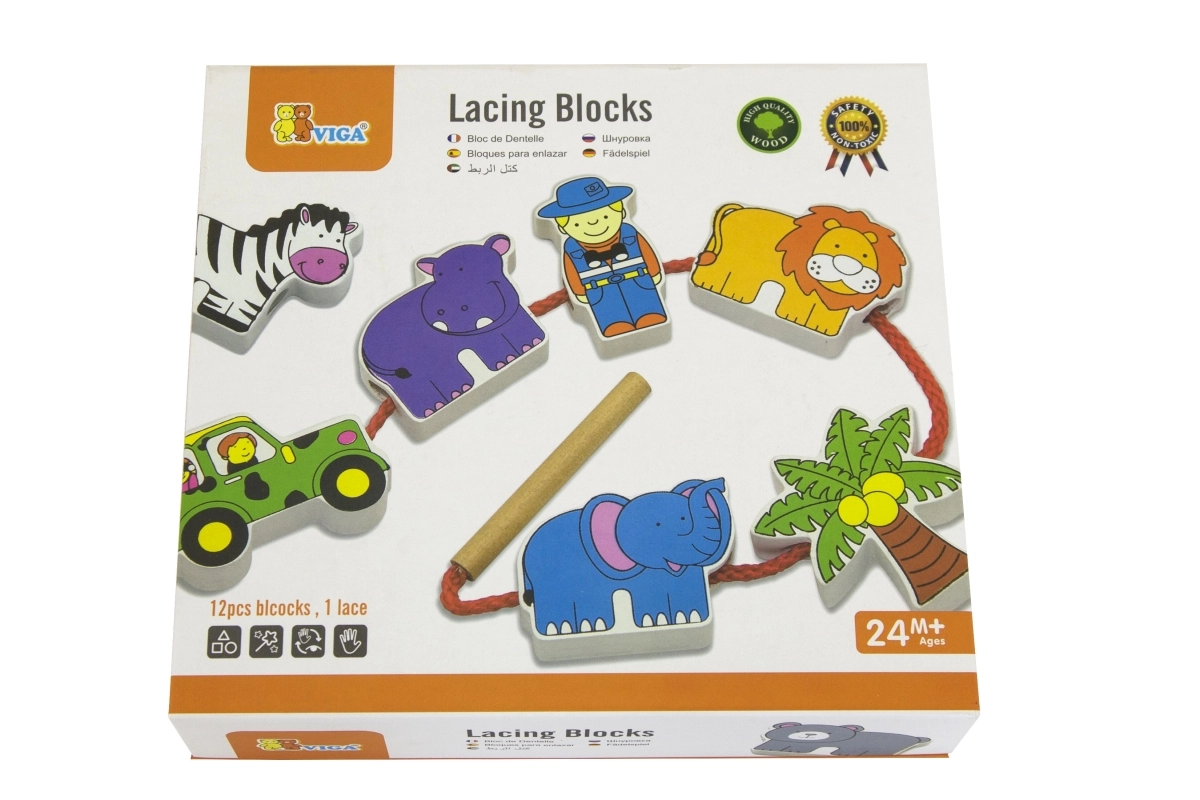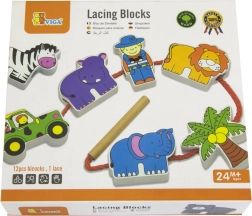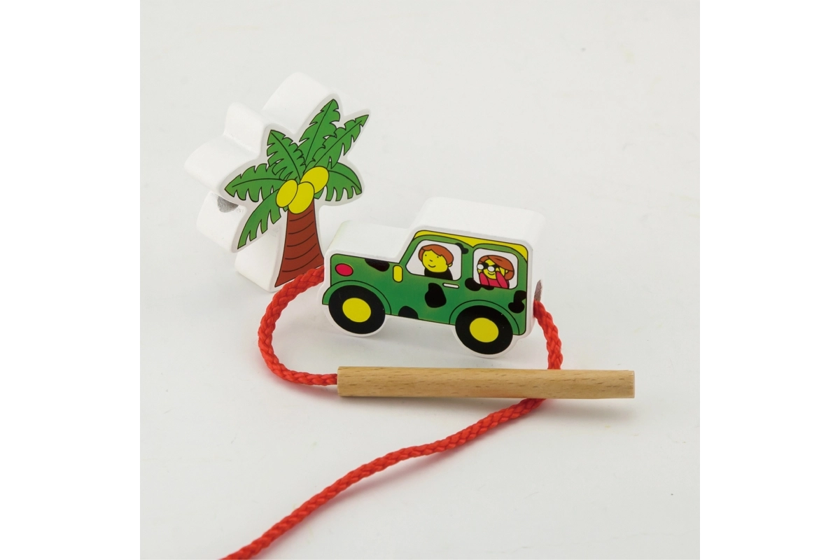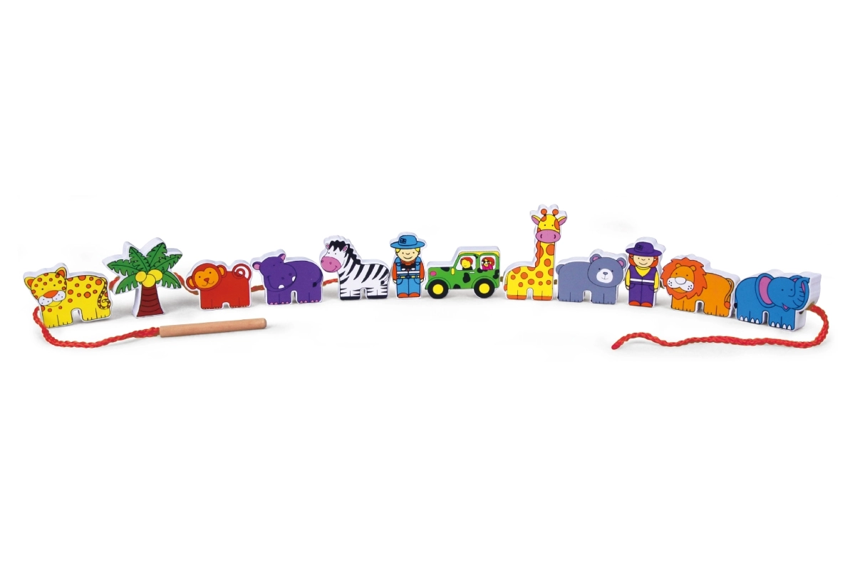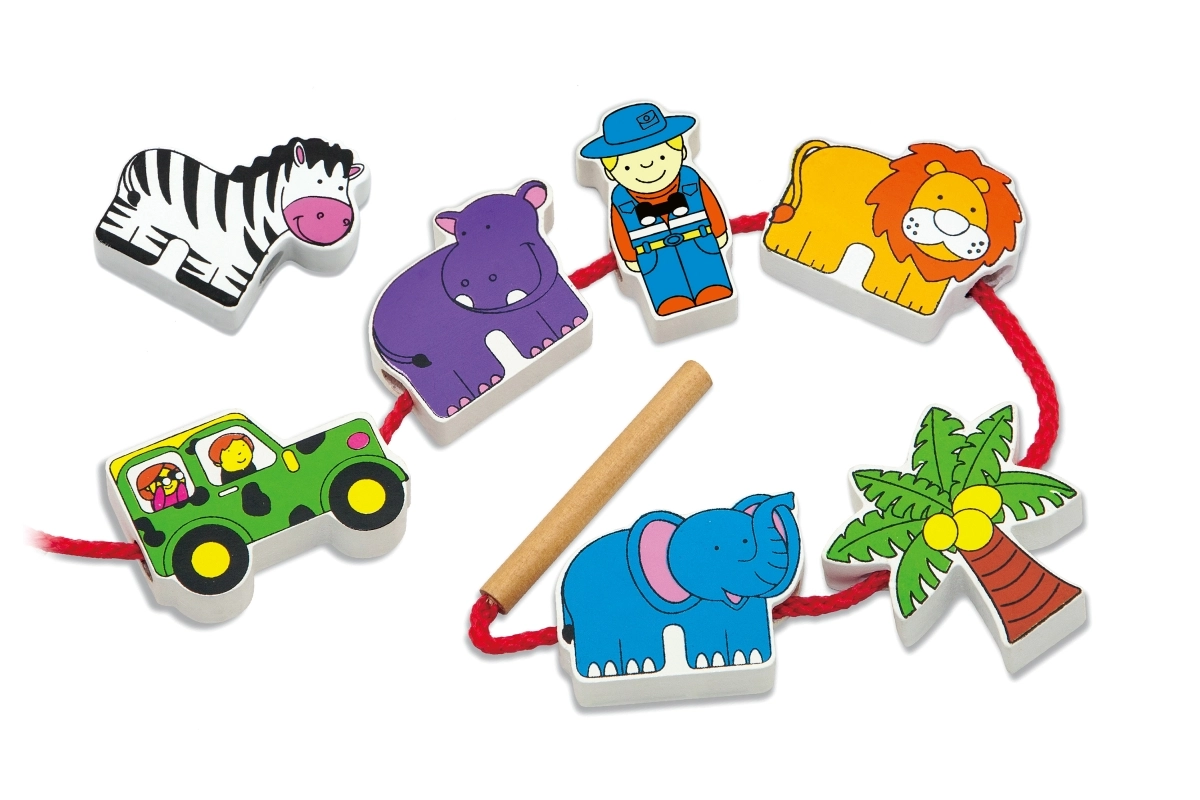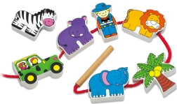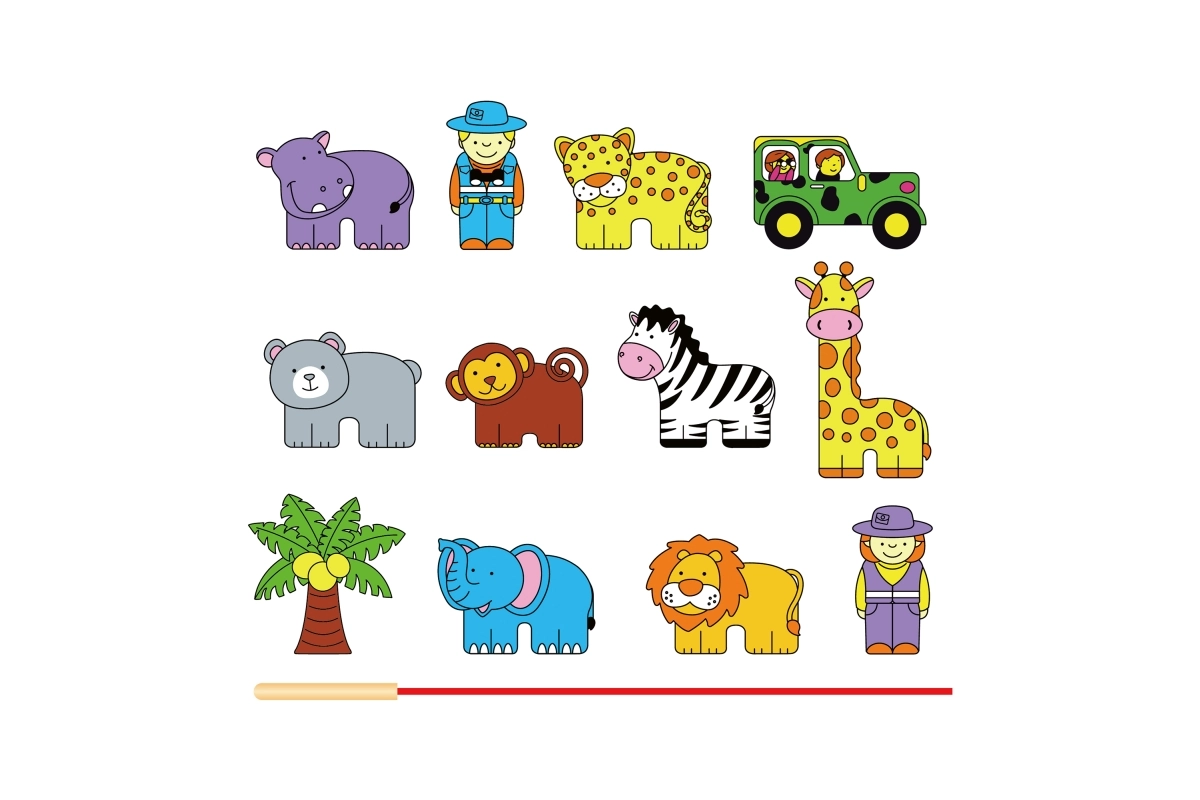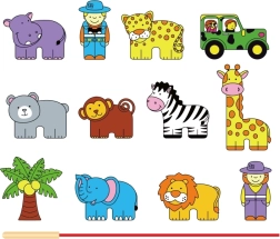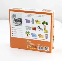 Komplektā ir koka klucīši ar safari iemītniekiem, tostarp leopards, palma, pērtiķis, nīlzirgs, zebras, džips, žirafe, lācis, lauva, zilonis un gids. Klucīši ir rūpīgi apgleznoti no abām pusēm ar netoksiskām krāsām un sagādā bērniem daudz prieka spēlējoties. Visi elementi ir veidoti, lai veicinātu sīkās motorikas un zināšanas par dzīvnieku pasauli.