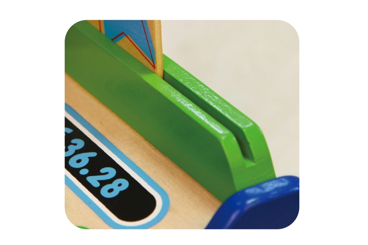 Šī krāsainā koka kase bērniem piedāvā reālistisku iepirkšanās pieredzi – pogu spiešana, “skaidrās naudas” atvilktnes atvēršana, norēķini ar karti vai skeneri un “čeku” drukāšana. Pateicoties pārdomātiem piederumiem, bērni viegli trenē skaitīšanu, komunikāciju un sadarbību.