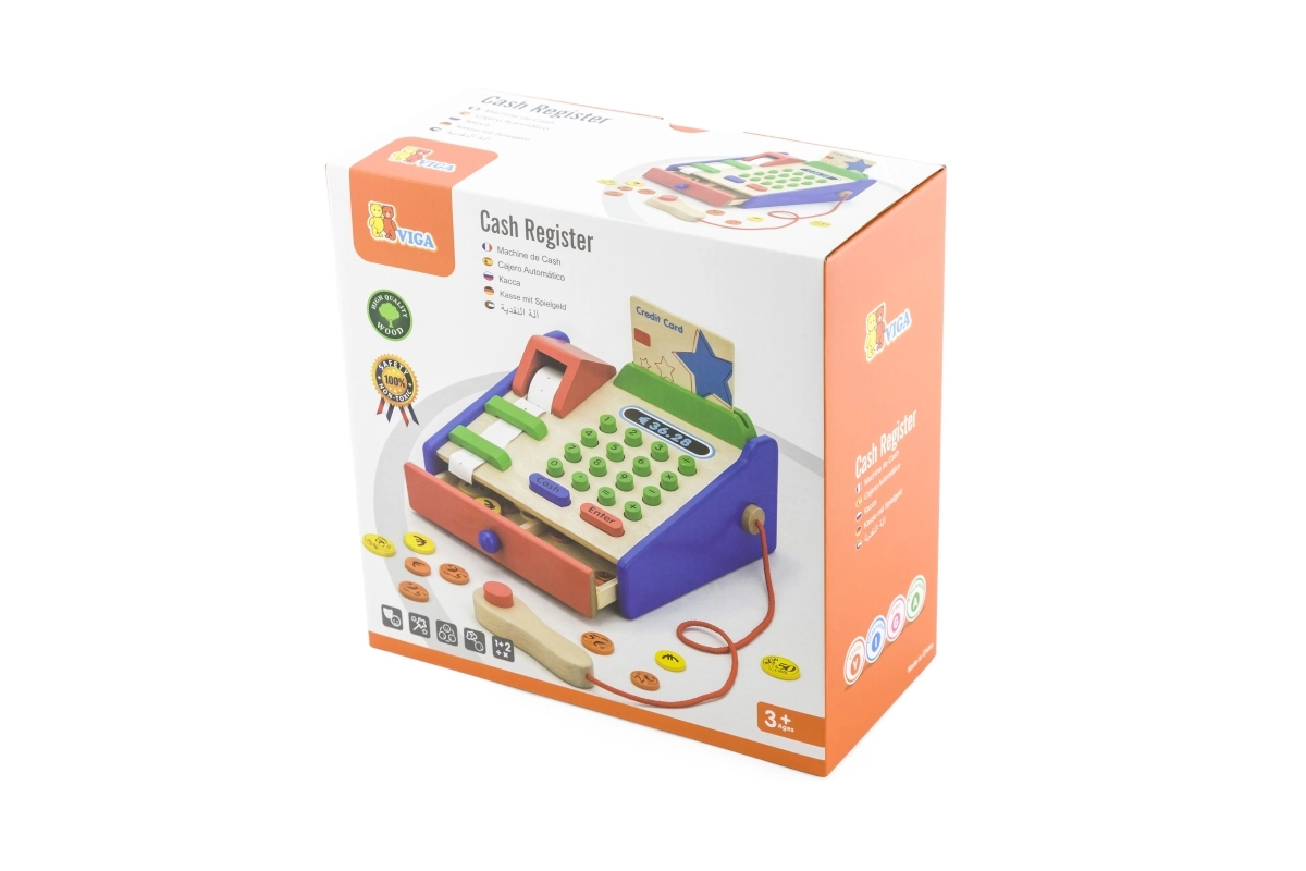 Kase izgatavota galvenokārt no koka un papildināta ar izturīgām plastmasas detaļām. Ideāli piemērota veikala spēlei mājās vai bērnudārzā, kur dabiski attīsta loģisko domāšanu, kognitīvās prasmes un attiecības ar skaitļiem Montessori garā.