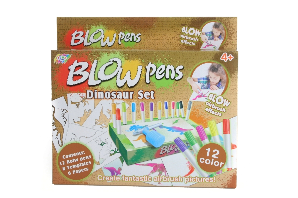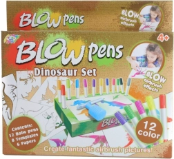 12 pūšamie flomāsteri, 8 trafareti, 6 papīra lapas, pūšanas uzgalis ar pumpīti, kartona pamatne un flomāsteru turētājs