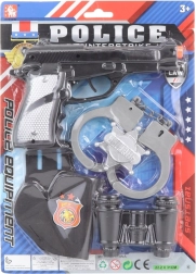 Izklaidējošs policijas komplekts mazajiem varoņiem ietver visu nepieciešamo aktīvām rotaļām: plastmasas pistoli apm. 19,5 cm, pistoles maksti, plastmasas rokudzelžus, tālskati un žetonu. Ideāli bērniem no 3 gadu vecuma, attīsta iztēli un policista lomu.