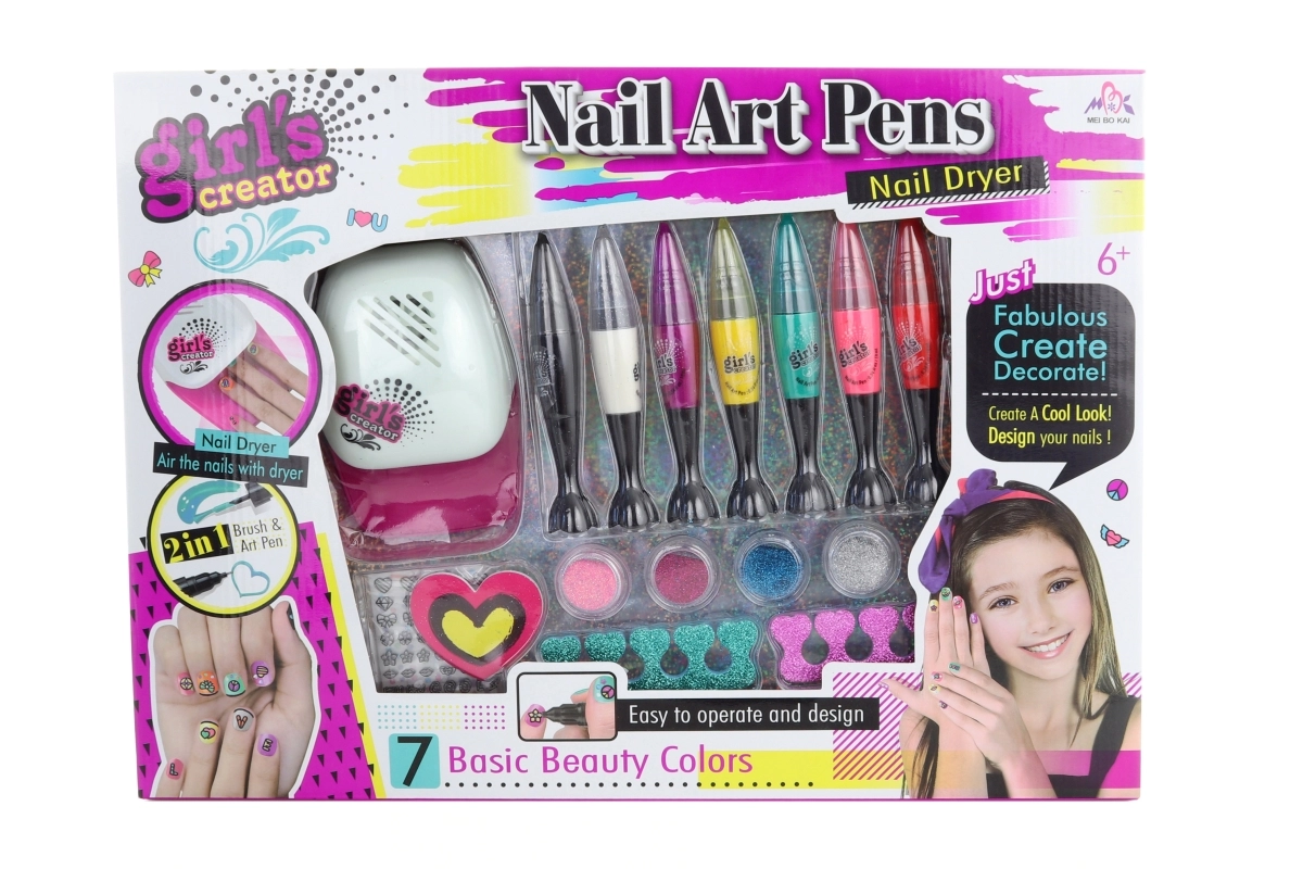 Izveidojiet mājās savu nagu mākslas šedevru ar pilno radošo komplektu mazajām stilistēm. Komplektā ietilpst 7 krāsaini lakas ar abpusēju aplikatoru (otiņa un pildspalva), nagu žāvētājs darbībai ar 2× AAA baterijām, vīlīte, pirkstu atdalītāji, mirdzuma pulveri un krāsainas uzlīmes. Ideāli bērniem no 6 gadu vecuma.