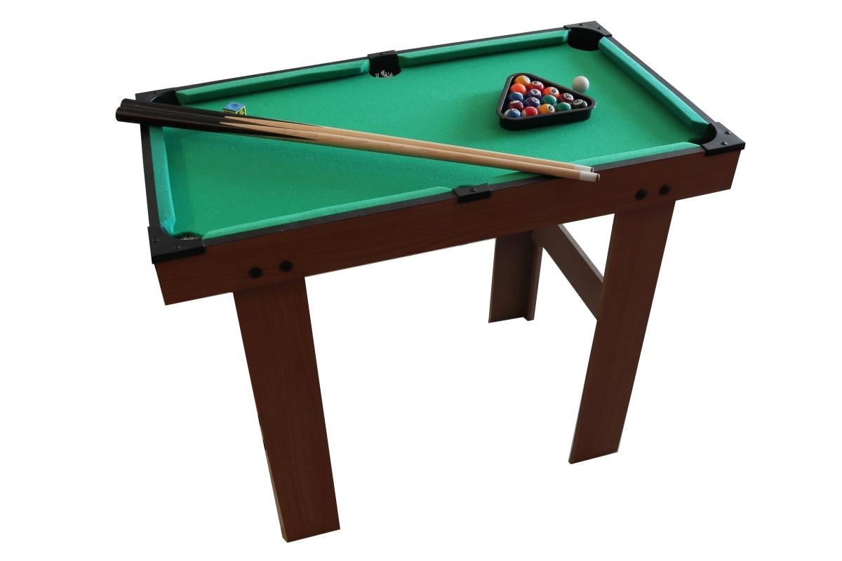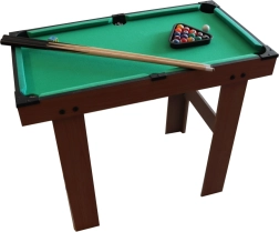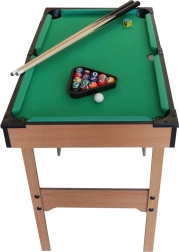 Kompakts bērnu biljards kvalitatīvā koka izpildījumā sniedz lielisku izklaidi gan mazajiem, gan lielākiem spēlētājiem. Komplektā ir 2 kijas, 16 biljarda bumbas un pilns piederumu komplekts. Pateicoties izmēriem, tas ir ideāli piemērots bērnu istabai un pirmajai iepazīšanai ar spēles noteikumiem.