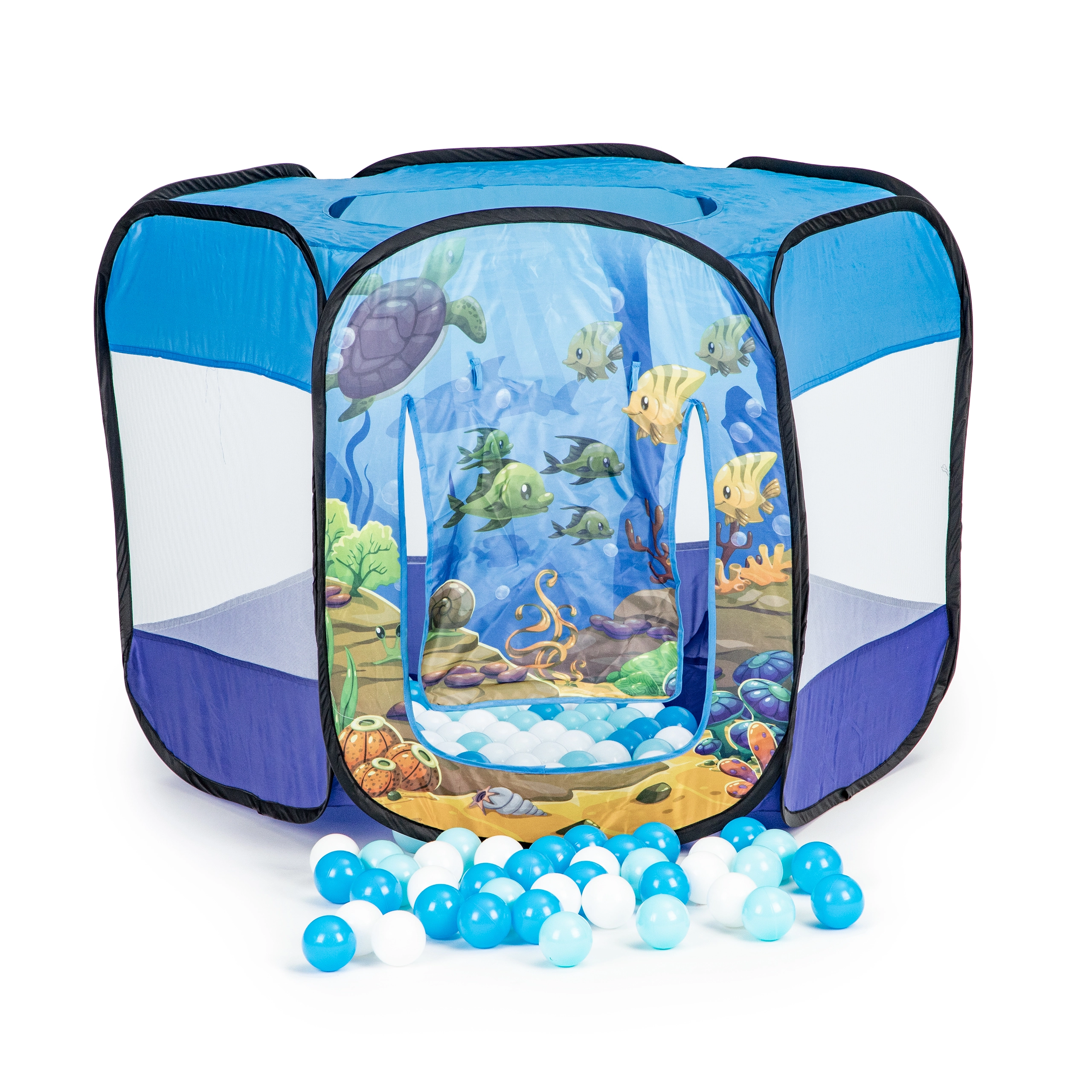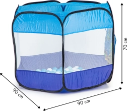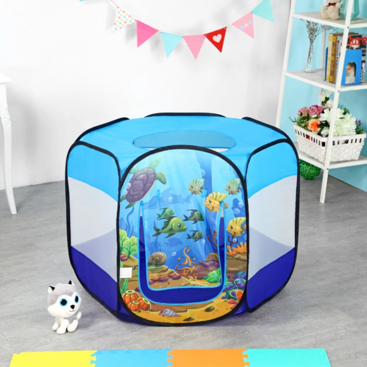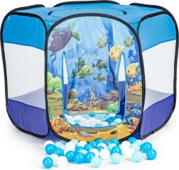 Viegls un stabils pop-up telts bērniem ar zemūdens pasaules motīvu pārvērtīs jebkuru istabu vai dārzu jautrā rotaļu laukumā. Komplektā ietilpst 100 krāsainas bumbiņas, gaisa caurlaidīgas sietveida sienas, rulējamas ieejas atvere un logs jumtā. Pašizklājama konstrukcija nodrošina ātru uzstādīšanu un ērtu pārnēsāšanu.