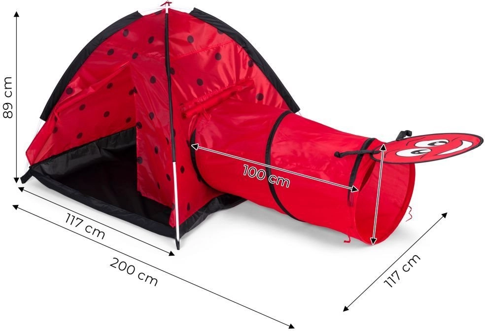 Pārvērtiet istabu vai dārzu piedzīvojumu pilnā vietā. Bērnu telts ar mārītes motīvu aicina bērnus atklāt un radoši rotaļāties. Iglu konstrukcija ar vienām durvīm un savienojumu tunelim veicina kustību, rāpošanu un paslēpes, attīstot gan motoriku, gan iztēli. Pateicoties vieglajam rāmim, telti ir viegli pārvietot, lai bērni to varētu izbaudīt jebkur.