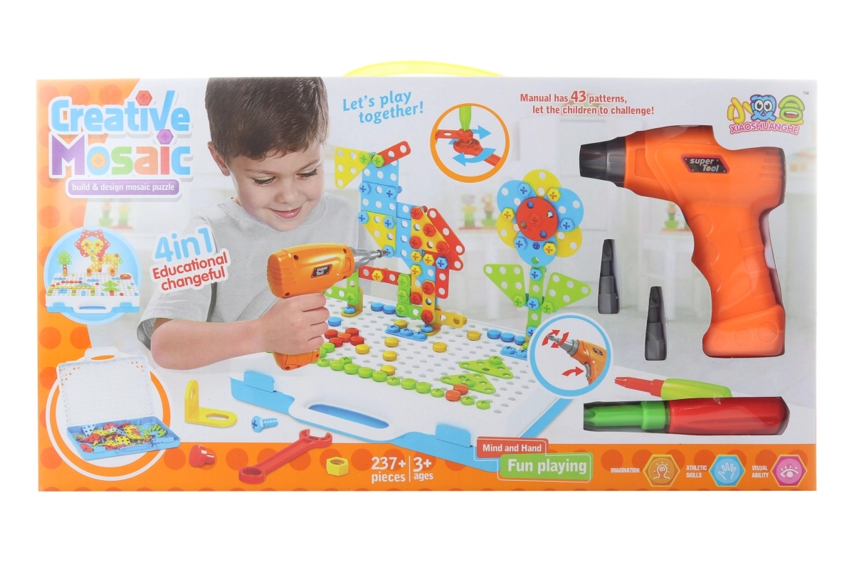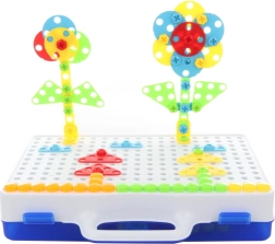 Radošā skrūvējama konstruktorspēle ar urbi bērniem no 3 gadu vecuma piedāvā stundām ilgu izklaidi un mācīšanos. Praktiskā koferītī atradīsiet 237 detaļas, bērnu urbi, skrūvgriezi un instrukciju. Bērni attīsta sīkās motorikas prasmes, radošumu un loģisko domāšanu, veidojot krāsainus rakstus un 3D veidojumus uz perforētās plāksnes.
