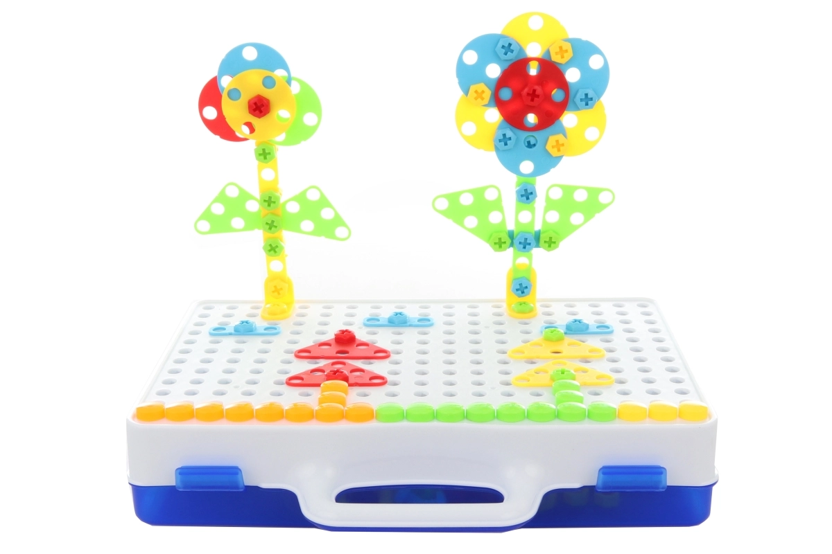 No detaļām var veidot ziedus, rakstus un vienkāršus 3D objektus. Bērni jautrā veidā trenē sīko motoriku, loģiku un iztēli.