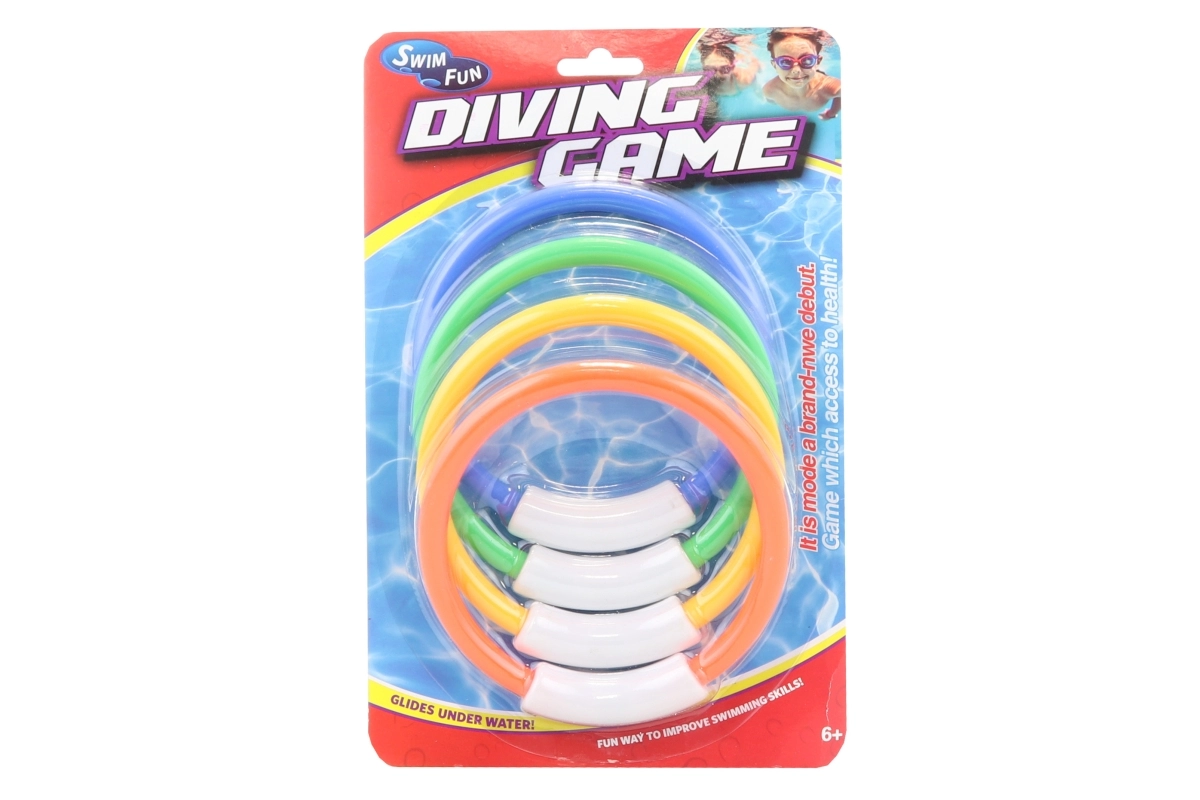 Padariet peldēšanu par izklaidi un treniņu ar šo 4 krāsainu niršanas gredzenu komplektu. Iemetot ūdenī, tie automātiski nogrimst līdz dibenam un uz dibena paliek vertikālā pozīcijā ērtai satveršanai. Ideāli piemēroti peldēšanas un niršanas treniņiem un spēlēm mājas baseinā pieaugušā uzraudzībā.