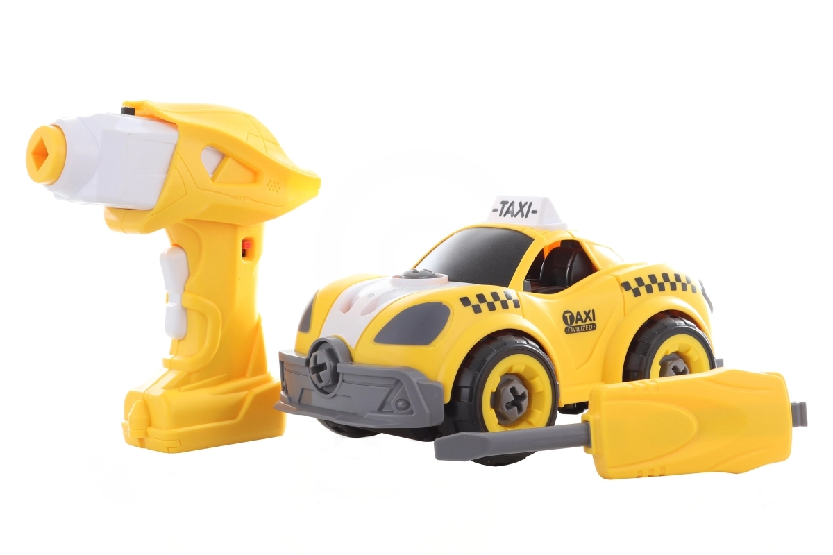 Uzbūvē, pieskrūvē un brauc! Šis radošais komplekts apvieno skrūvējamu dzeltena taksometra modeli ar iespēju pārvērst to par tālvadāmu auto. Vispirms bērni paši saliek auto, izmantojot skrūvgriezi vai urbjmašīnu, pēc tam izņem motoru no urbjmašīnas, ievieto to auto un izbauda vienkāršu vadību uz priekšu un atpakaļ.