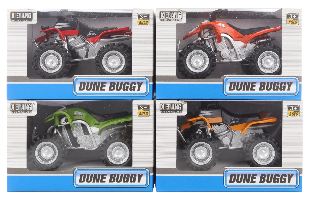 Reālistisks metāla kvadricikls iepriecinās mazos braucējus no 3 gadu vecuma. Pateicoties kompaktajiem izmēriem, tas ērti ietilpst plaukstā un nodrošina izturīgu izpildījumu ilgai izklaidei. Metāla korpuss, detalizēts izpildījums un izturīga konstrukcija garantē lielisku spēli gan mājās, gan ceļā.