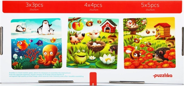 Izklaidējoša un izglītojoša Puzzlika puzle pašiem mazākajiem piedāvā trīs atsevišķus attēlus no 50 izturīgiem gabaliņiem. Bērni trenē loģisko domāšanu, sīko motoriku un radošumu, vienlaikus saliekot košas ainas no dabas un dzīvnieku pasaules. Lieli, izturīgi gabaliņi no videi draudzīga kartona ir ideāli mazām rociņām un tos ir viegli kopt.