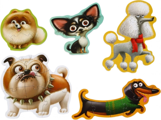 Šis Puzzlika bērnu pužļu komplekts piedāvā 5 mīlīgus suņu attēlus, ko bērni saliek no dažādas grūtības pakāpes gabaliņiem (4–8 uz vienu attēlu). Pateicoties lielajiem un stingrajiem gabaliņiem, puzle labi turas mazajās rociņās un veicina koncentrēšanos un pacietību.
