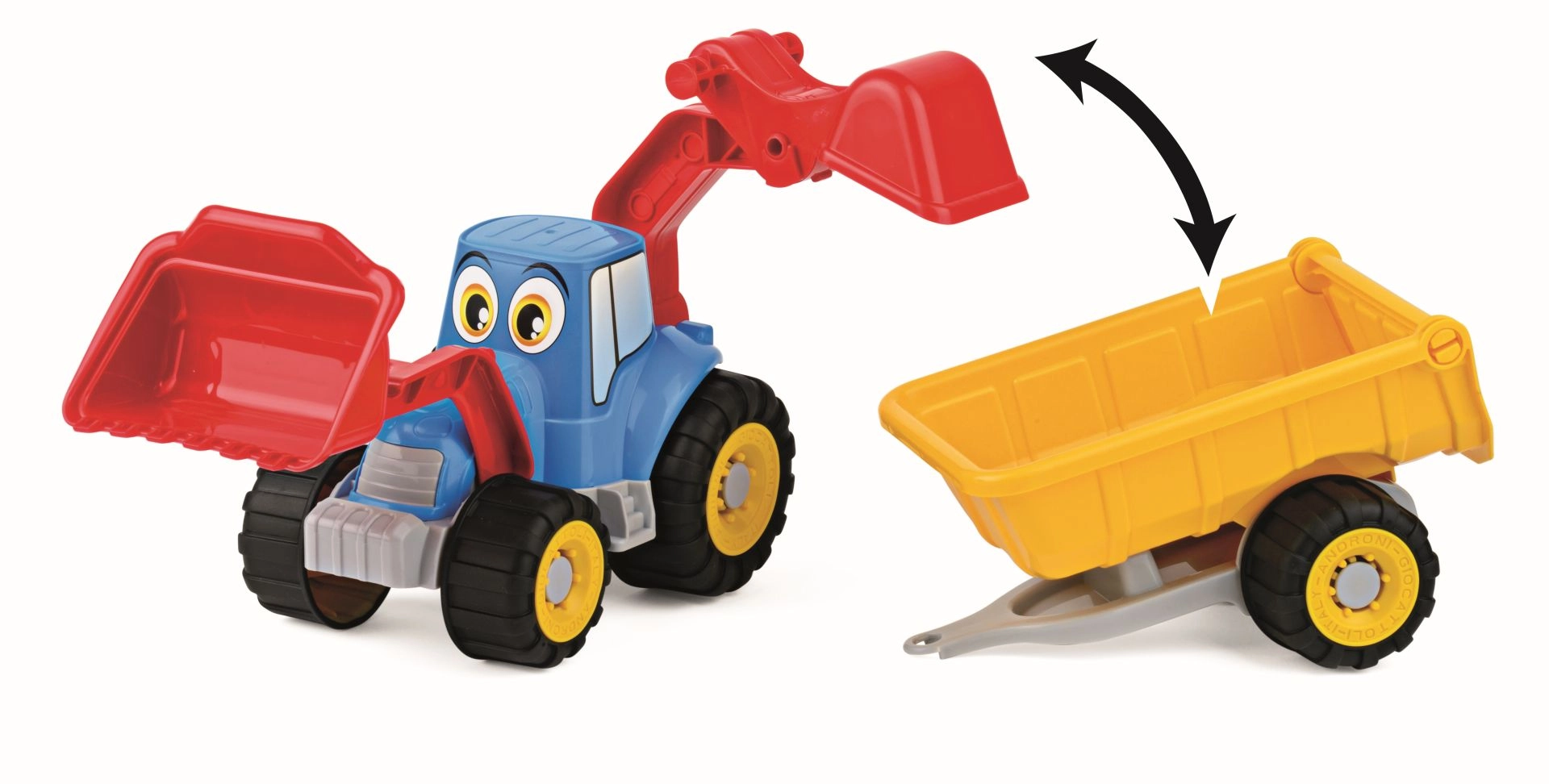 Krāsains bērnu traktors ar iekrāvēju, aizmugures racēja kausu un piekabi iepriecinās mazos autovadītājus no 12 mēnešu vecuma. Tam ir gumēti riteņi labākai gaitai, nolaižama piekabes aizmugures borta daļa un tas ir izgatavots no kvalitatīviem itāļu plastmasas materiāliem. Garums 55 cm nodrošina lielisku stabilitāti un daudz jautrības gan mājās, gan dārzā.