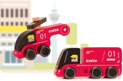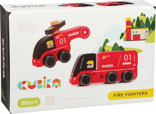 Koka komplekts CUBIKA ugunsdzēsēji ietver vienu ugunsdzēsēju auto un vienu helikopteru, izgatavotus no kvalitatīva bērza un kļavas. Pateicoties noapaļotām malām un drošām ūdens bāzes krāsām, tas ir ideāli piemērots bērniem no 3 gadu vecuma. Sertifikāti TÜV un Eiropas standarts EN 71 nodrošina augstu drošības līmeni. Ražots Eiropā. Auto garums 12 cm, helikoptera 10 cm.