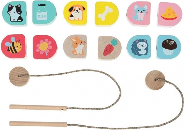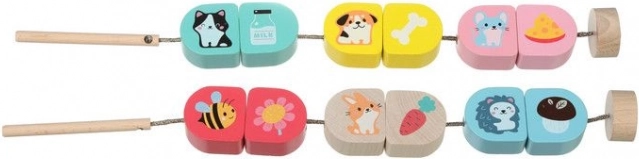 - 12 koka savēramie elementi (6 pāri), 2 aukliņas ar koka stienīti un stopieri