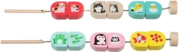 Koka detaļu vēršana ir vieglāka, pateicoties irbulītim uz aukliņas. Bērni trenē satvērienu, precizitāti un pacietību, veidojot dzīvnieku pārus.
