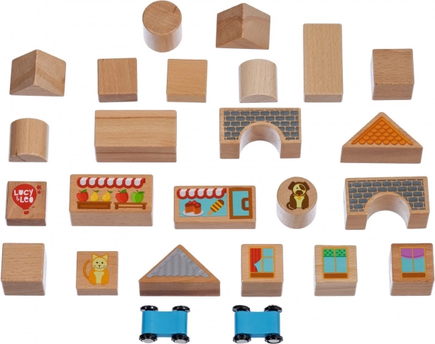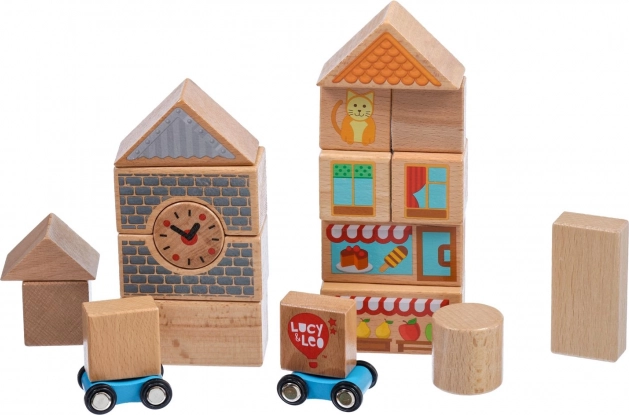 Lucy & Leo pilsēta – koka klucīšu komplekts ar divām mašīnītēm, 25 detaļas